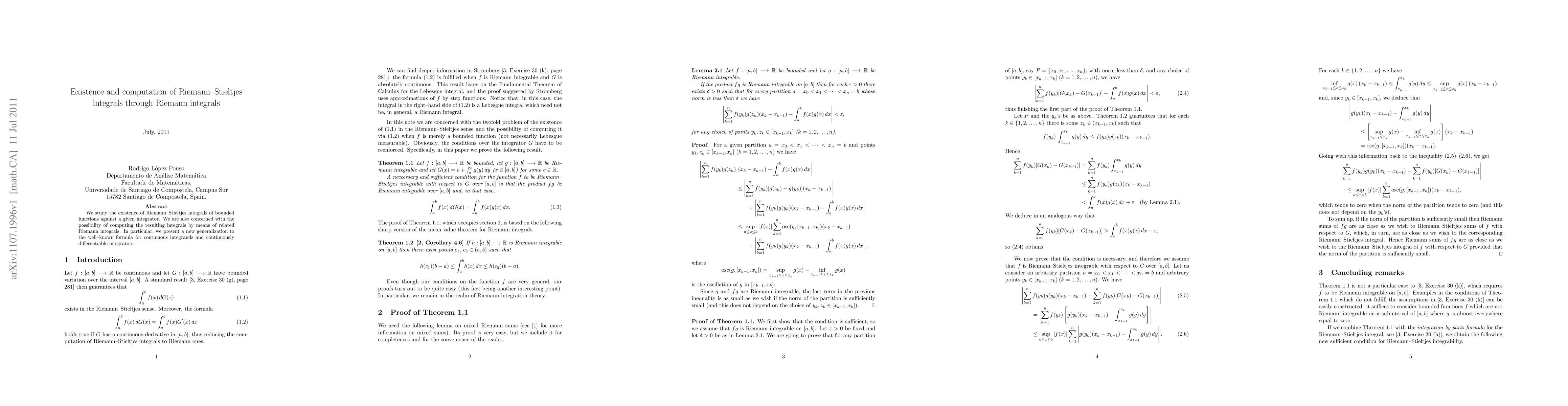 This paper explores the existence of Riemann-Stieltjes integrals for bounded functions and investigates their computation via related Riemann integrals. It introduces a novel generalization of the formula for continuous integrands and continuously differentiable integrators.