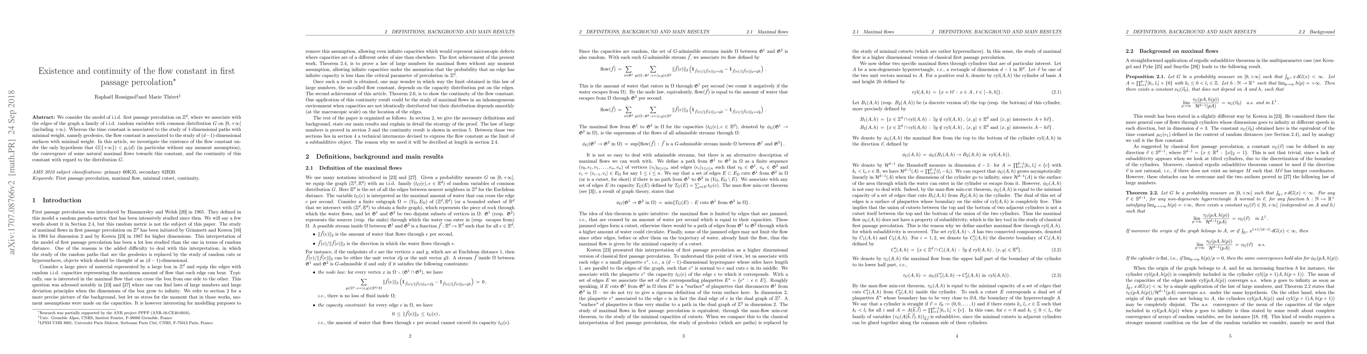 This paper investigates the existence and continuity of the flow constant in first passage percolation on Z^d, focusing on minimal weight (d-1)-dimensional surfaces without requiring any moment assumptions, and examines its convergence and continuity concerning the distribution G.
