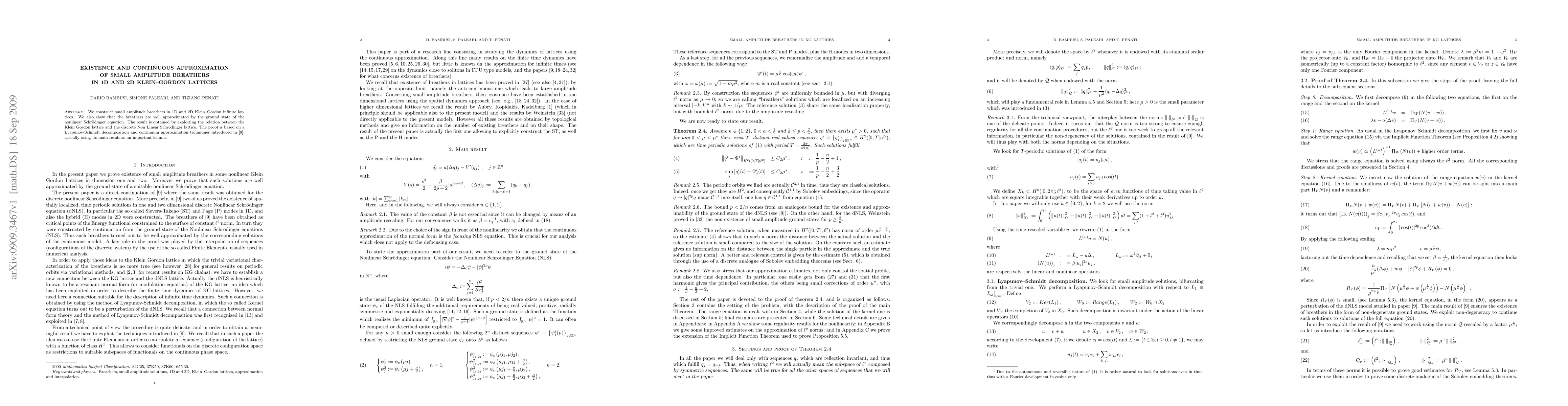 This paper constructs small amplitude breathers in 1D and 2D Klein-Gordon lattices and demonstrates their approximation by the ground state of the nonlinear Schrödinger equation, leveraging the connection between the Klein Gordon and discrete nonlinear Schrödinger lattices. The proof utilizes Lyapunov-Schmidt decomposition and continuum approximation techniques.