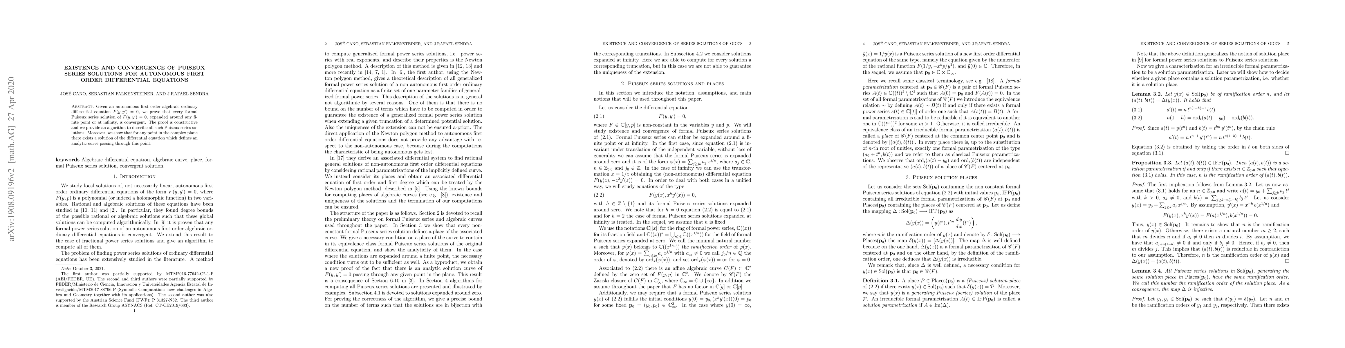 This paper proves the convergence of Puiseux series solutions for autonomous first-order algebraic differential equations and provides a constructive algorithm to describe these solutions. It also demonstrates the existence of solutions that pass through any point in the complex plane.
