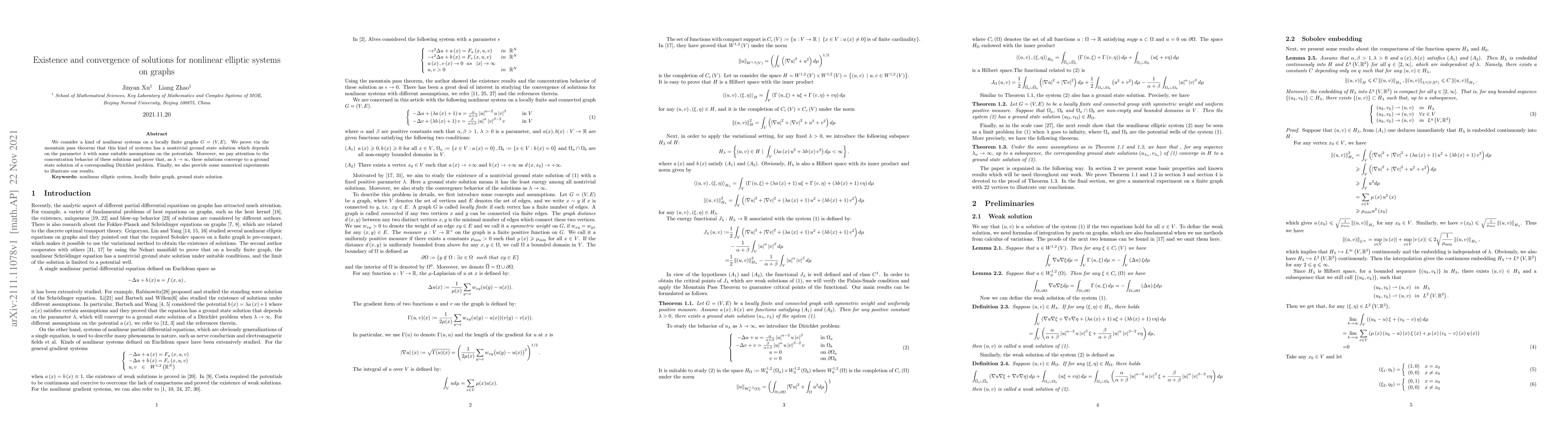 This paper proves the existence and convergence of nontrivial ground state solutions for nonlinear elliptic systems on locally finite graphs, utilizing the mountain pass theorem. As a parameter λ approaches infinity, these solutions converge to a ground state solution of a related Dirichlet problem, with numerical experiments supporting the theoretical findings.