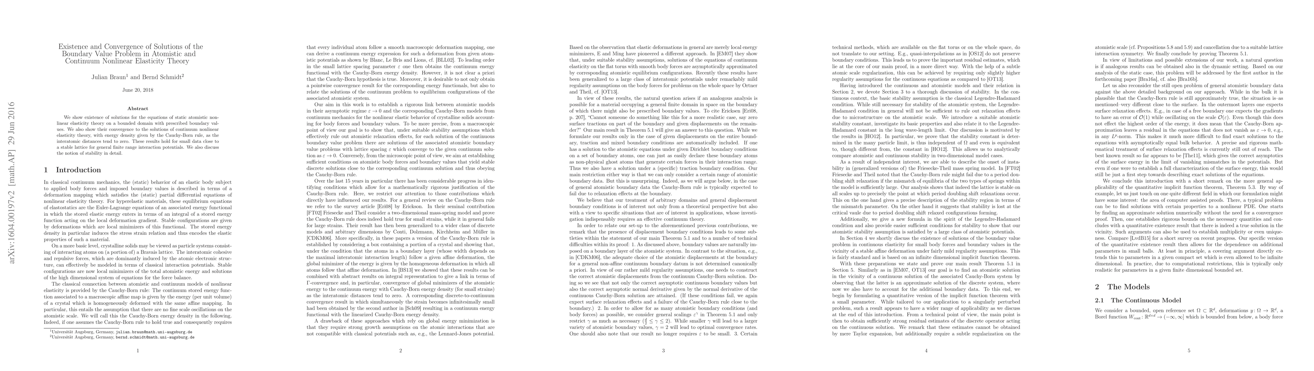 This paper establishes the existence of solutions for static atomistic nonlinear elasticity and demonstrates their convergence to continuum elasticity solutions as interatomic distances approach zero. It also explores stability and applies to small data near stable lattices for various interaction potentials.