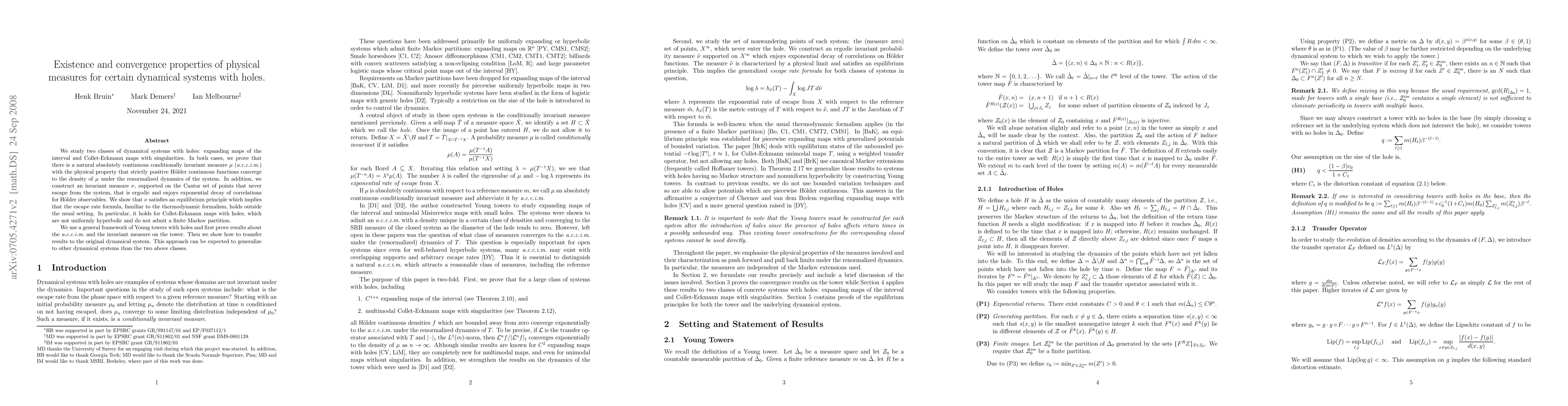 We study two classes of dynamical systems with holes: expanding maps of the interval and Collet-Eckmann maps with singularities. In both cases, we prove that there is a natural absolutely continuous conditionally invariant measure $\mu$ (a.c.c.i.m.) with the physical property that strictly positive H\"{o}lder continuous functions converge to the density of $\mu$ under the renormalized dynamics of the system. In addition, we construct an invariant measure $\nu$, supported on the Cantor set of points that never escape from the system, that is ergodic and enjoys exponential decay of correlations for H\"{o}lder observables. We show that $\nu$ satisfies an equilibrium principle which implies that the escape rate formula, familiar to the thermodynamic formalism, holds outside the usual setting. In particular, it holds for Collet-Eckmann maps with holes, which are not uniformly hyperbolic and do not admit a finite Markov partition. We use a general framework of Young towers with holes and first prove results about the \accim and the invariant measure on the tower. Then we show how to transfer results to the original dynamical system. This approach can be expected to generalize to other dynamical systems than the two above classes.