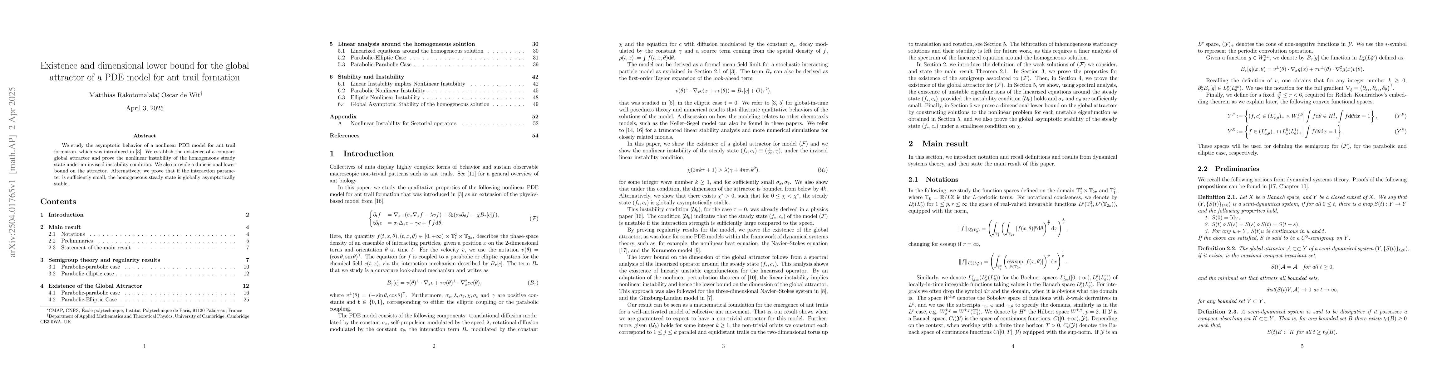 A nonlinear PDE model for ant trail formation shows a compact global attractor that is either globally asymptotically stable or nonlinearly unstable, depending on the interaction parameter.