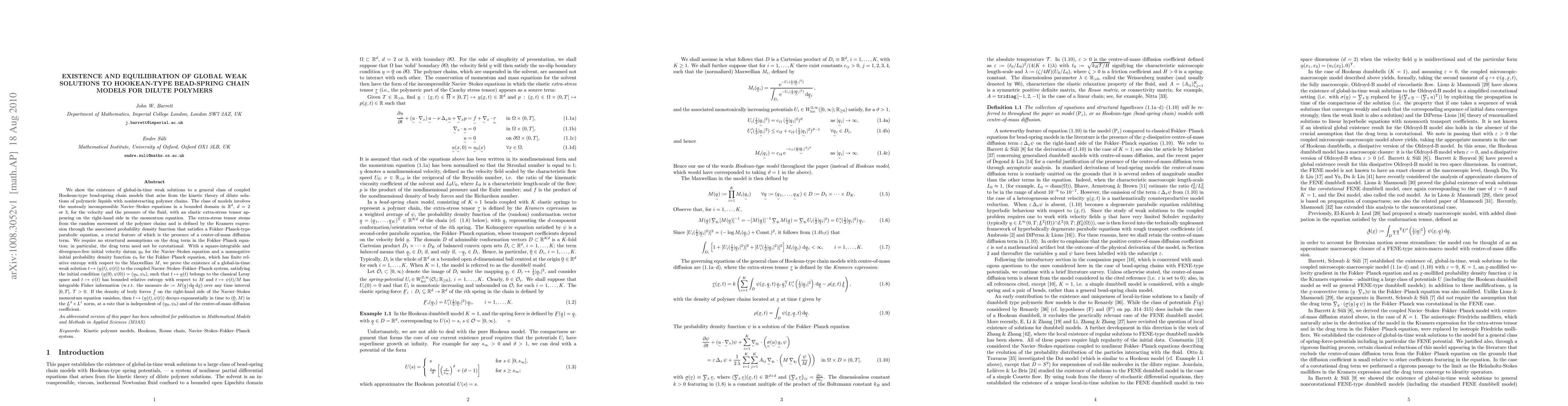 Researchers prove the existence of global weak solutions to models simulating dilute polymers in fluids, showing they decay exponentially to equilibrium in the absence of external forces.