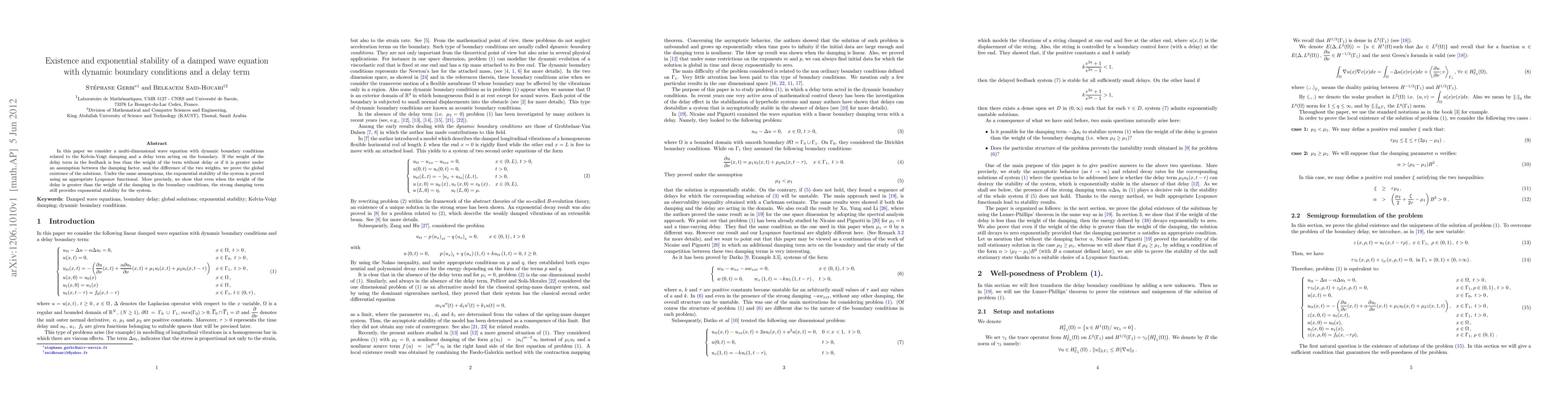 This paper investigates a multi-dimensional wave equation with dynamic boundary conditions and a delay term, proving global existence and exponential stability under specific conditions. The study demonstrates that strong damping can ensure stability despite the presence of a delay term.