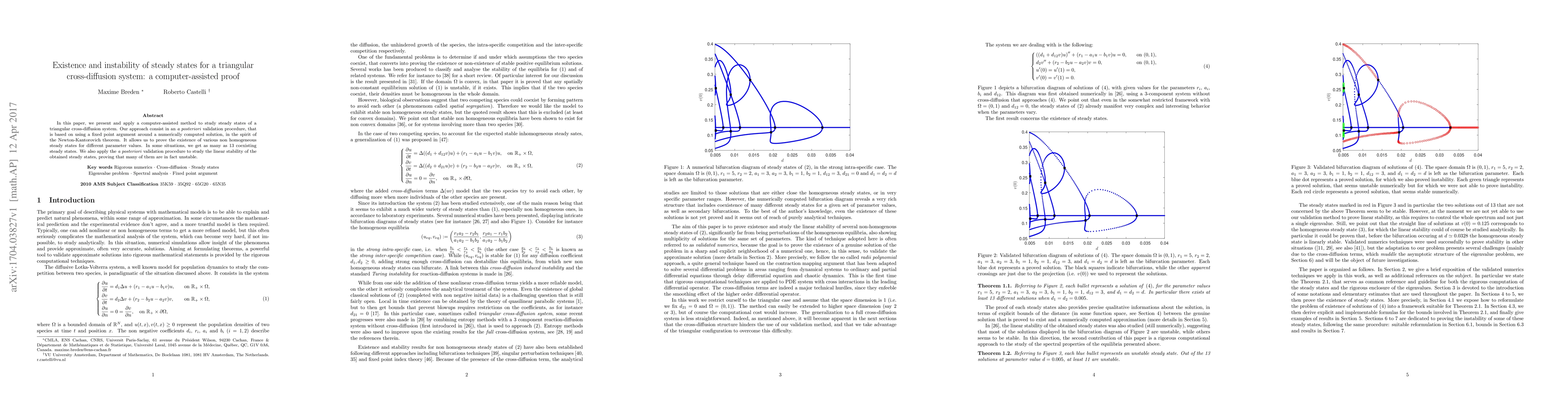This paper employs a computer-assisted method to validate the existence and instability of steady states in a triangular cross-diffusion system. The authors use a fixed point argument to prove the existence of up to 13 coexisting steady states and demonstrate the instability of many of these states through a linear stability analysis.