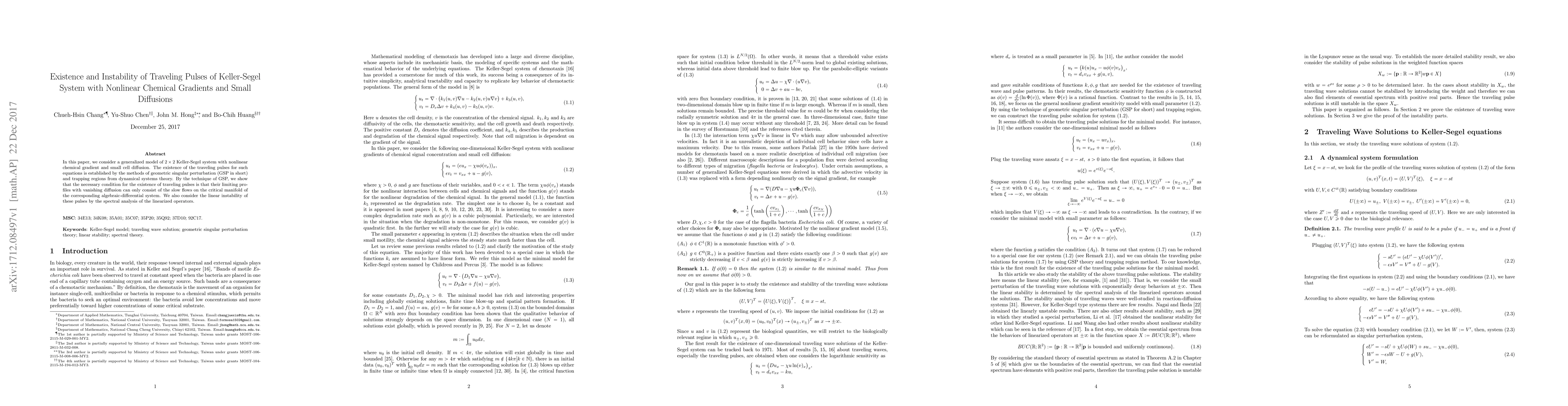 This paper investigates the existence and instability of traveling pulses in a generalized Keller-Segel system with nonlinear chemical gradients and small diffusion. The study employs geometric singular perturbation and dynamical systems theory to establish the existence of these pulses, and spectral analysis to examine their linear instability.