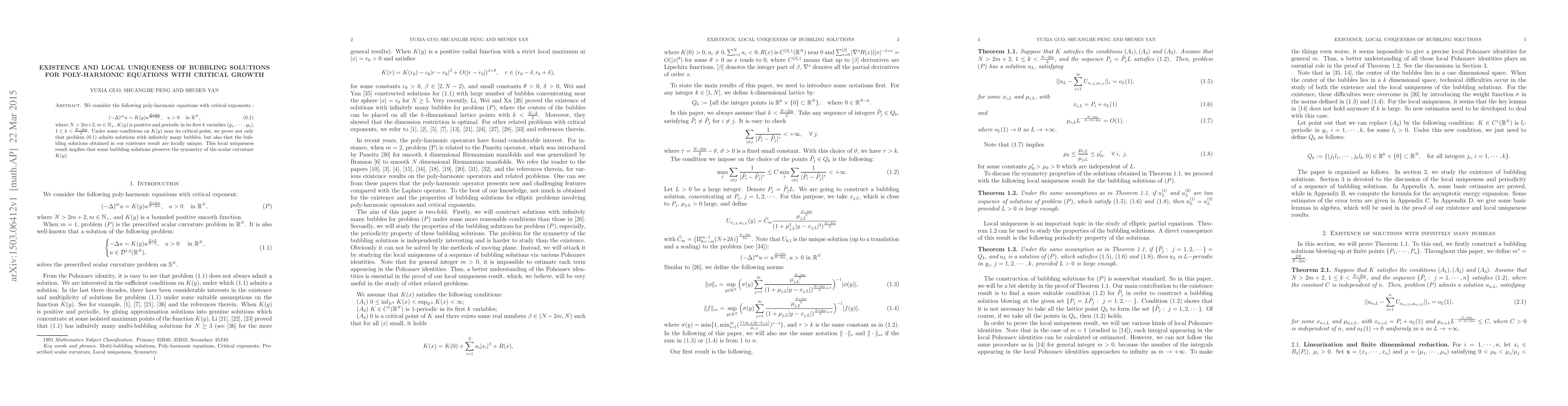 \begin{abstract} We consider the following poly-harmonic equations with critical exponents: \begin{equation}\label{P} (-\Delta)^m u =K(y)u^{\frac{N+2m}{N-2m}},\;\;\; u>0\;\;\;\hbox{in} \mathbb{R}^N, \end{equation} where $N> 2m+2,m\in\mathbb{N}_{+}, K(y)$ is positive and periodic in its first $k$ variables $(y_1,\cdots, y_k)$, $1\leq k<\frac{N-2m}{2}$. Under some conditions on $K(y)$ near its critical point, we prove not only that problem~\eqref{P} admits solutions with infinitely many bubbles, but also that the bubbling solutions obtained in our existence result are locally unique. This local uniqueness result implies that some bubbling solutions preserve the symmetry of the scalar curvature $K(y).$
