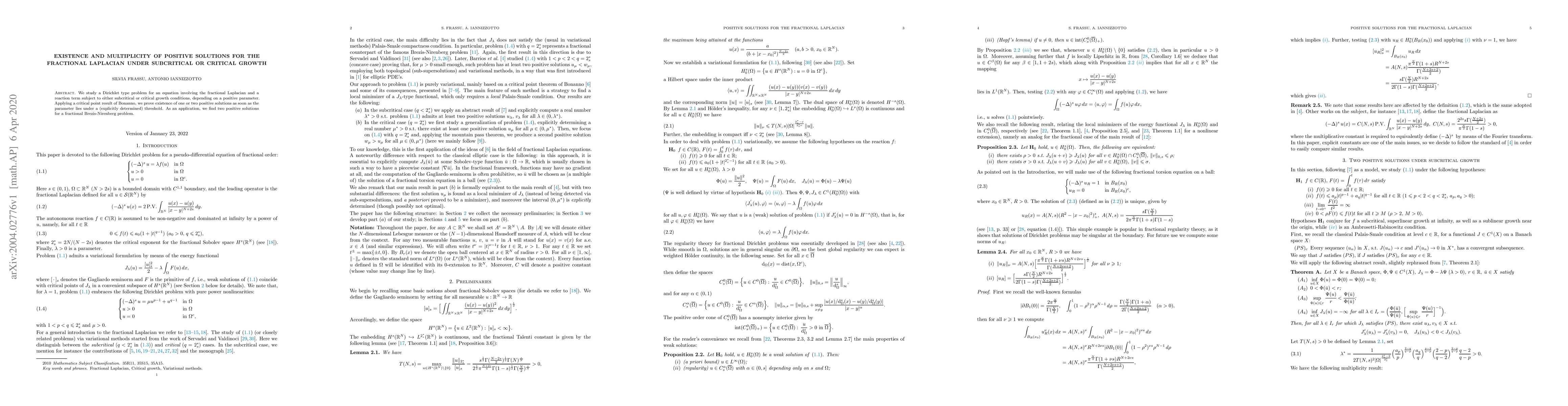 This paper investigates the existence and multiplicity of positive solutions for a fractional Laplacian equation under subcritical or critical growth conditions. Using a critical point theorem, it proves the existence of one or two solutions depending on the parameter's value, and applies this to find two positive solutions for a fractional Brezis-Nirenberg problem.