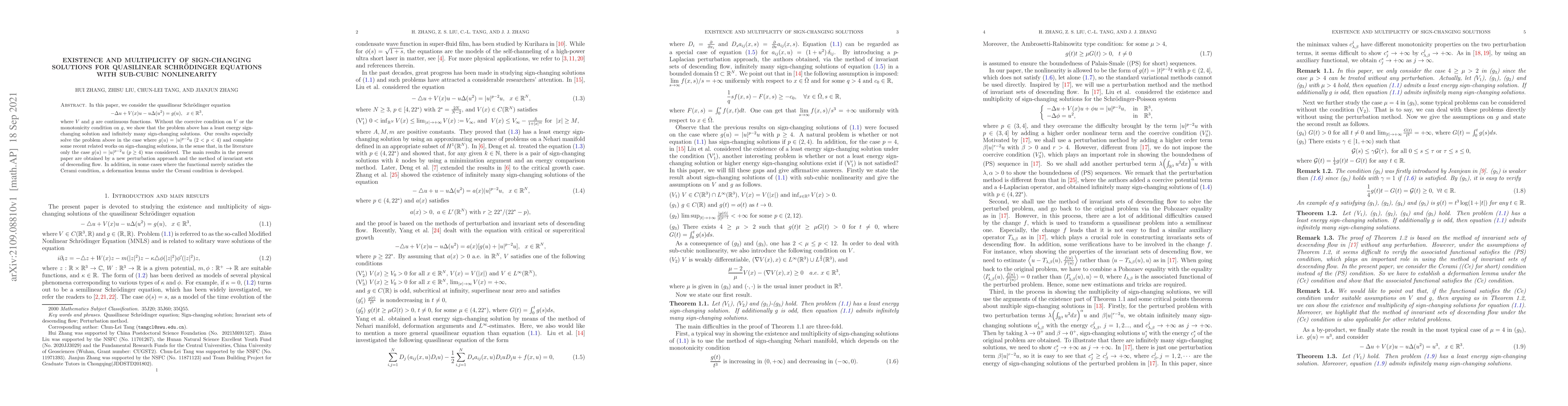 This paper investigates quasilinear Schrödinger equations with sub-cubic nonlinearity, proving the existence of a least energy sign-changing solution and infinitely many such solutions without coercive conditions. The results extend previous findings to the case where the nonlinearity is sub-quadratic ($2<p<4$).