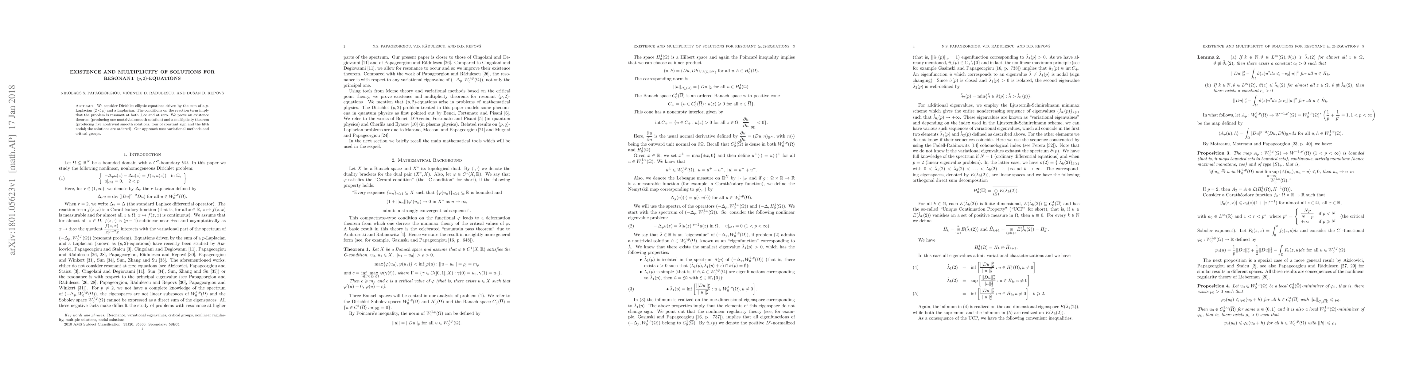 This research paper establishes existence and multiplicity theorems for resonant Dirichlet elliptic equations driven by a p-Laplacian and Laplacian, proving one nontrivial solution and up to five solutions with varying signs and a nodal solution.