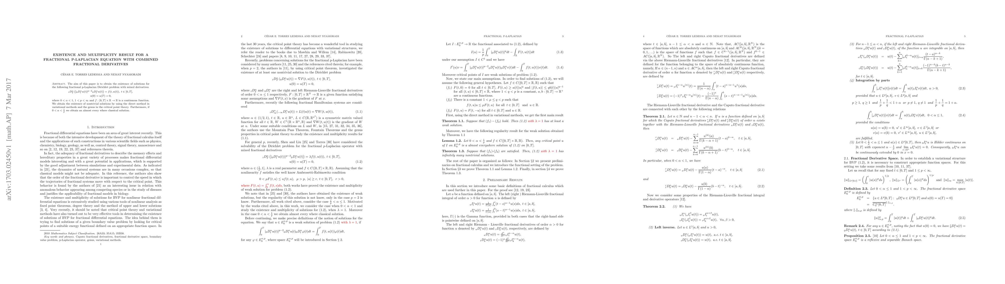 This paper proves the existence of solutions for a fractional p-Laplacian equation with combined fractional derivatives, using variational methods and critical point theory. For certain conditions, it also shows that nontrivial solutions can be found.