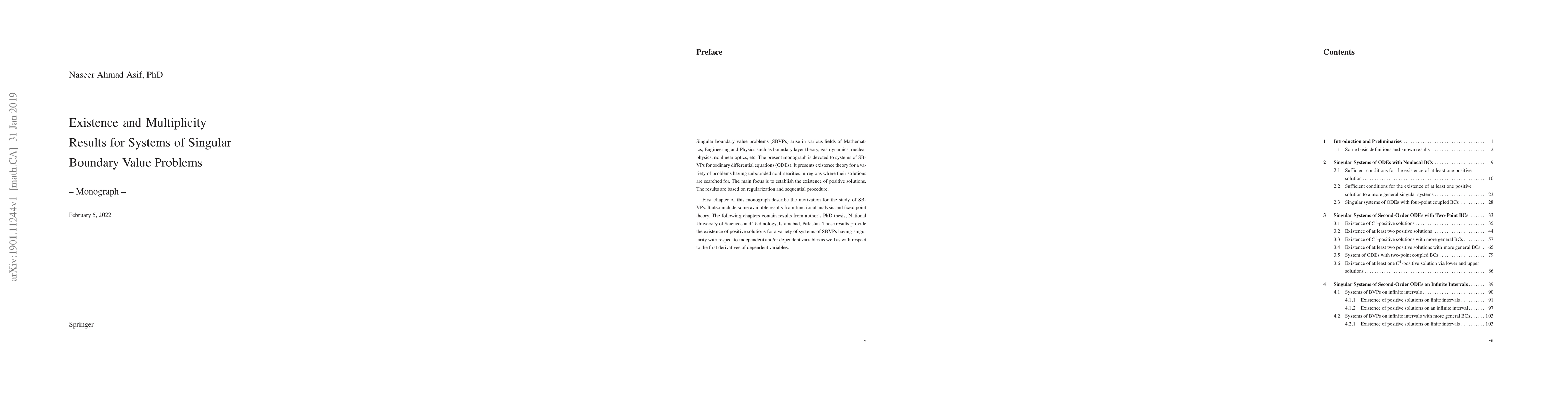 Singular boundary value problems (SBVPs) arise in various fields of Mathematics, Engineering and Physics such as boundary layer theory, gas dynamics, nuclear physics, nonlinear optics, etc. The present monograph is devoted to systems of SBVPs for ordinary differential equations (ODEs). It presents existence theory for a variety of problems having unbounded nonlinearities in regions where their solutions are searched for. The main focus is to establish the existence of positive solutions. The results are based on regularization and sequential procedure. First chapter of this monograph describe the motivation for the study of SBVPs. It also include some available results from functional analysis and fixed point theory. The following chapters contain results from author's PhD thesis, National University of Sciences and Technology, Islamabad, Pakistan. These results provide the existence of positive solutions for a variety of systems of SBVPs having singularity with respect to independent and/or dependent variables as well as with respect to the first derivatives of dependent variables.