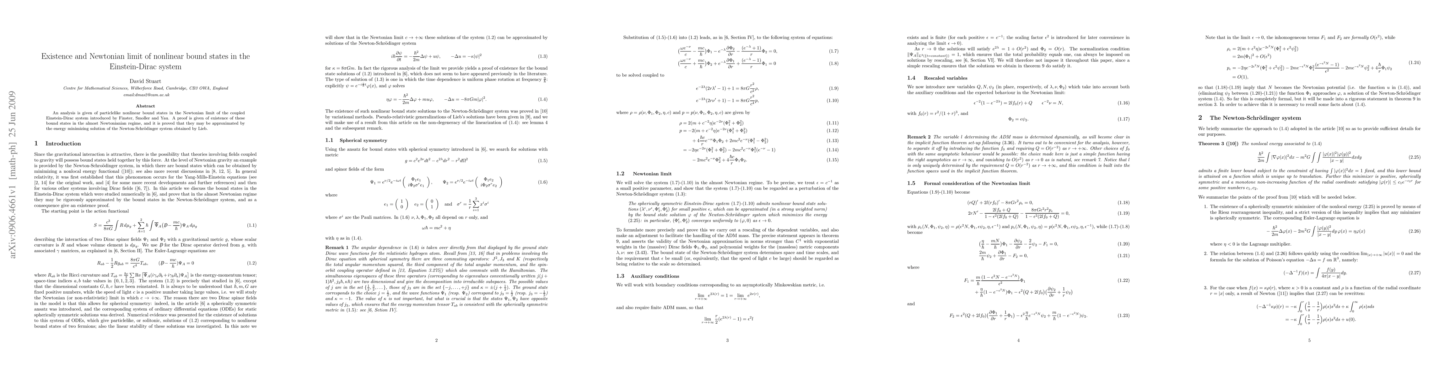 This paper proves the existence of particle-like nonlinear bound states in the Einstein-Dirac system's Newtonian limit, demonstrating these states can be approximated by solutions of the Newton-Schrödinger system proposed by Lieb.