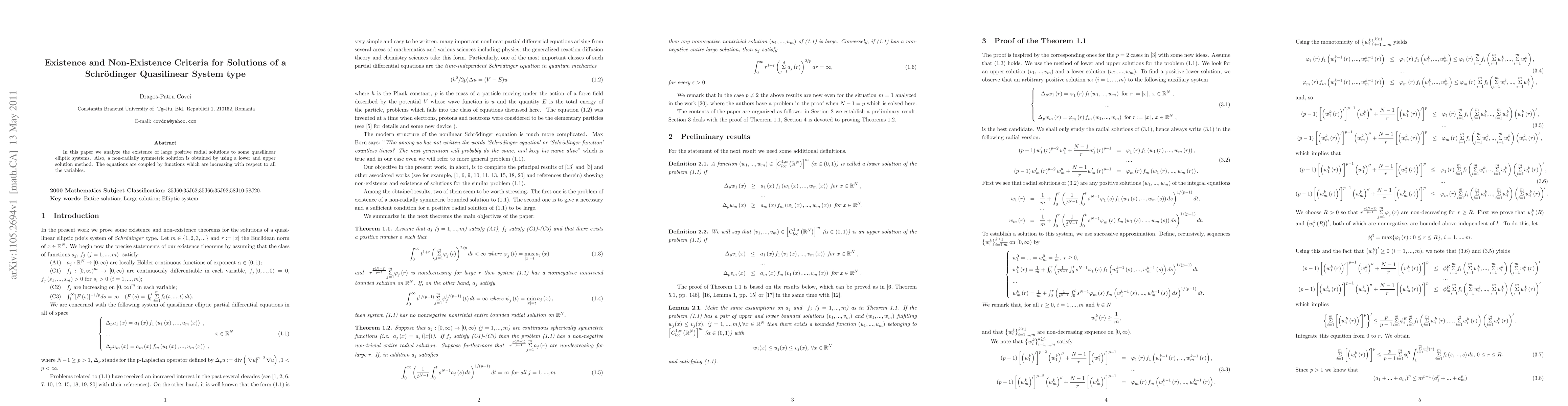 This paper investigates existence and non-existence criteria for solutions to a Schr"odinger quasilinear system type, focusing on large positive radial solutions and obtaining a non-radially symmetric solution using a lower and upper solution method.