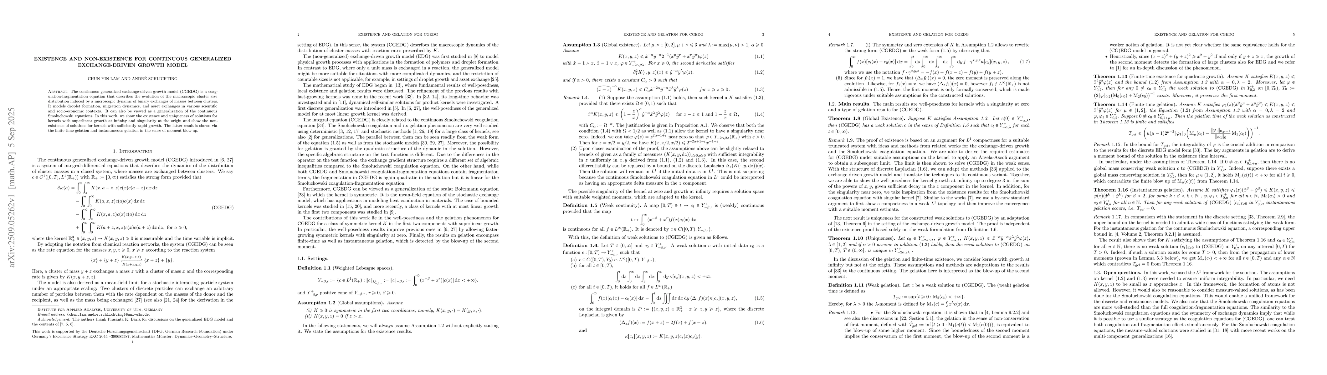 The continuous generalized exchange-driven growth model (CGEDG) is a coagulation-fragmentation equation that describes the evolution of the macroscopic cluster size distribution induced by a microscopic dynamic of binary exchanges of masses between clusters. It models droplet formation, migration dynamics, and asset exchanges in various scientific and socio-economic contexts. It can also be viewed as a generalization of the continuous Smoluchowski equations. In this work, we show the existence and uniqueness of solutions for kernels with superlinear growth at infinity and singularity at the origin and show the non-existence of solutions for kernels with sufficiently rapid growth. The latter result is shown via the finite-time gelation and instantaneous gelation in the sense of moment blow-up.