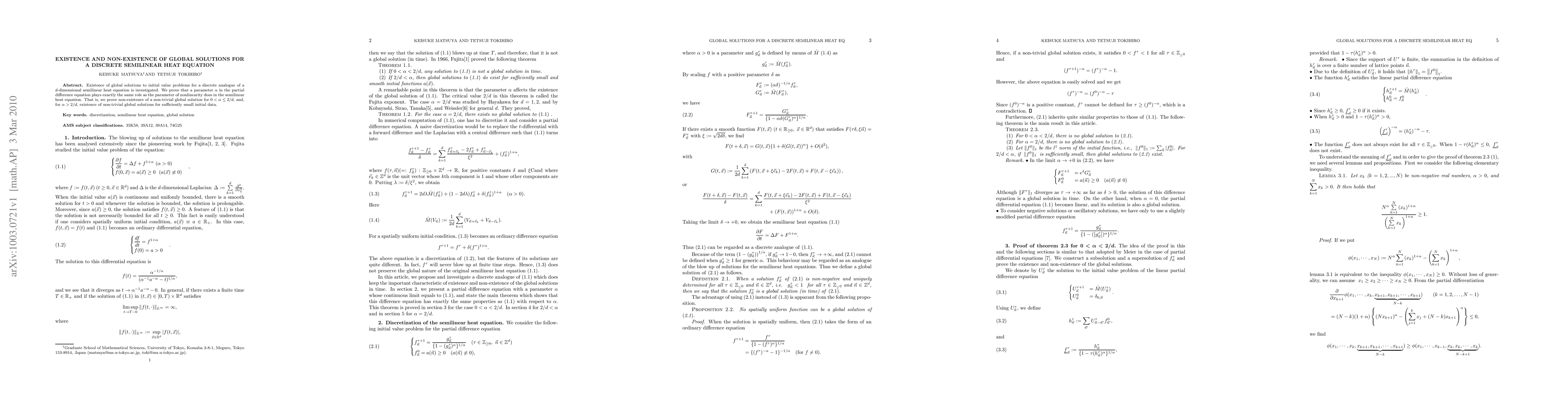 This paper investigates the existence and non-existence of global solutions for a discrete semilinear heat equation. It demonstrates that a parameter α determines the existence of non-trivial global solutions, proving non-existence for 0 < α ≤ 2/d and existence for α > 2/d when initial data is sufficiently small.
