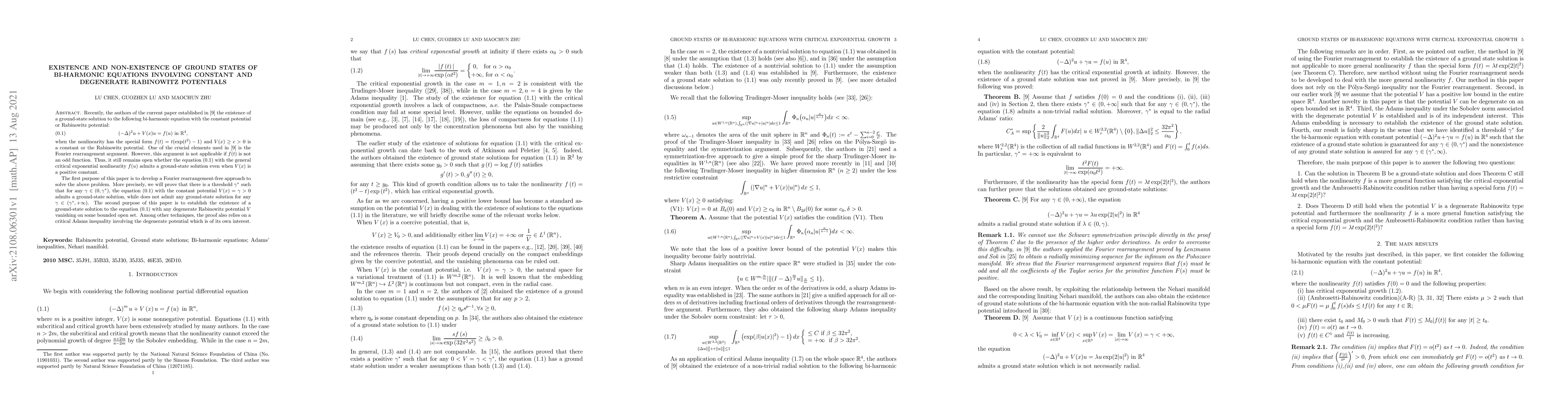 Recently, the authors of the current paper established in [9] the existence of a ground-state solution to the following bi-harmonic equation with the constant potential or Rabinowitz potential: \begin{equation} (-\Delta)^{2}u+V(x)u=f(u)\ \text{in}\ \mathbb{R}^{4}, \end{equation} when the nonlinearity has the special form $f(t)=t(\exp(t^2)-1)$ and $V(x)\geq c>0$ is a constant or the Rabinowitz potential. One of the crucial elements used in [9] is the Fourier rearrangement argument. However, this argument is not applicable if $f(t)$ is not an odd function. Thus, it still remains open whether the above equation with the general critical exponential nonlinearity $f(u)$ admits a ground-state solution even when $V(x)$ is a positive constant. The first purpose of this paper is to develop a Fourier rearrangement-free approach to solve the above problem. More precisely, we will prove that there is a threshold $\gamma^{*}$ such that for any $\gamma\in (0,\gamma^*)$, the above equation with the constant potential $V(x)=\gamma>0$ admits a ground-state solution, while does not admit any ground-state solution for any $\gamma\in (\gamma^{*},+\infty)$. The second purpose of this paper is to establish the existence of a ground-state solution to the above equation with any degenerate Rabinowitz potential $V$ vanishing on some bounded open set. Among other techniques, the proof also relies on a critical Adams inequality involving the degenerate potential which is of its own interest.