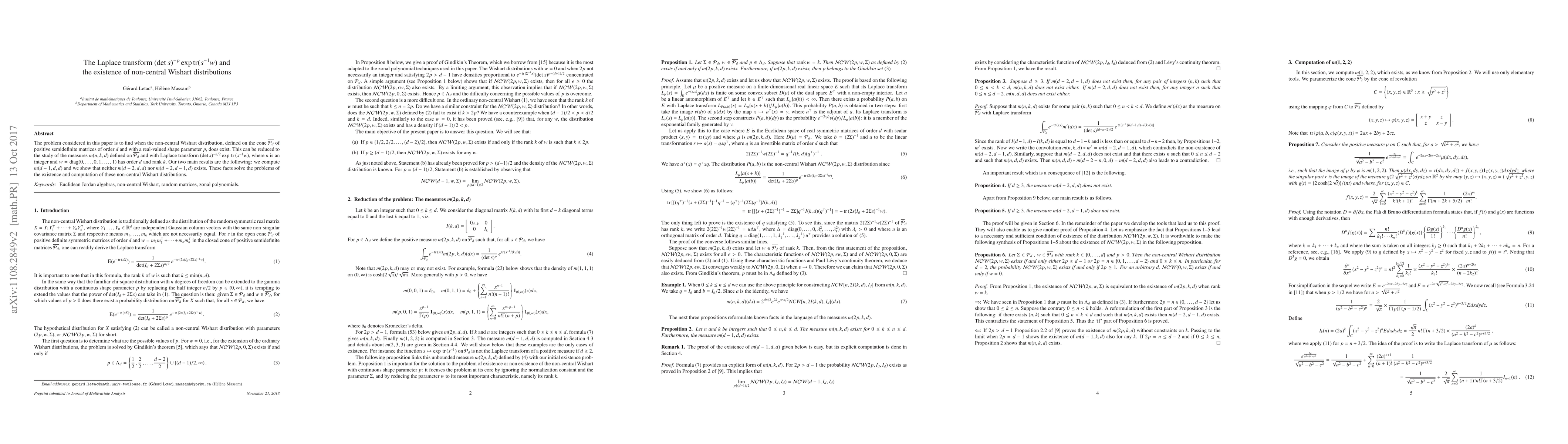 The problem considered in this paper is to find when the non-central Wishart distribution, defined on the cone $\bar{\mathcal{P}_d}$ of semi positive definite matrices of order $d$ and with a real valued shape parameter, exists. We reduce this problem to the problem of existence of the measures $m(n,k,d)$ defined on $\bar{\mathcal{P}_d}$ and with Laplace transform $(\det s)^{-n/2}\exp \tr(s^{-1}w)$ where $n$ is an integer and where $w=\mathrm{diag}(0,...,0,1,...,1)$ has order $d$ and rank $k.$ We compute $m(d-1,d,d)$ and we show that neither $m(d-2,d,d)$ nor $m(d-2,d-1,d)$ exist. This proves a conjecture of E. Mayerhofer.