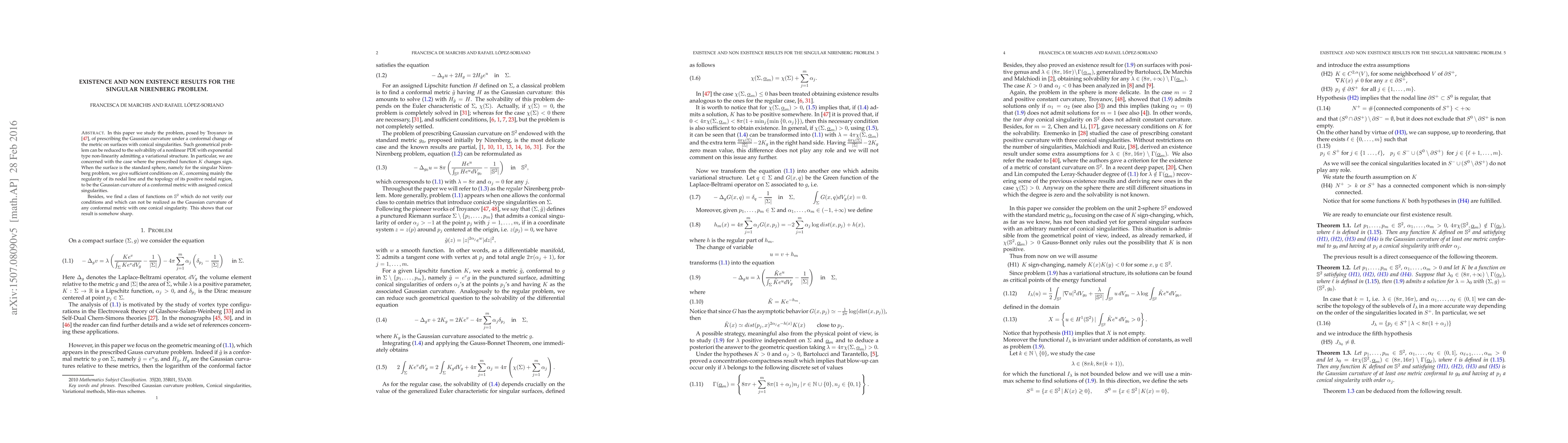Researchers solved a geometric problem about prescribing curvature on surfaces with conical singularities, finding sufficient conditions for the Gaussian curvature to exist, and identifying functions that cannot be realized as curvatures.