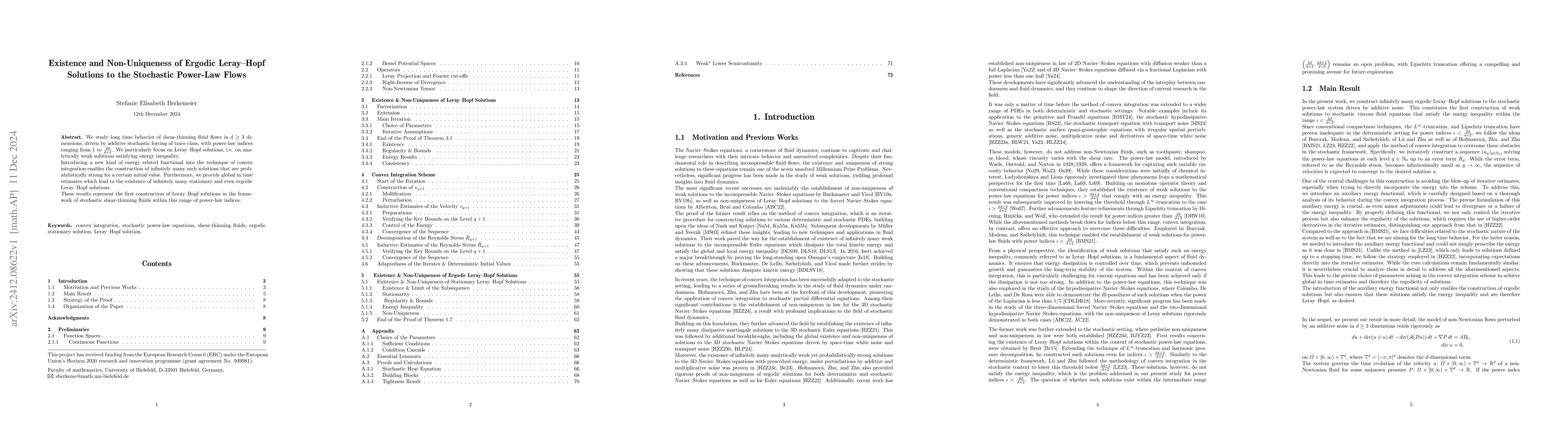We study long time behavior of shear-thinning fluid flows in $d \geq 3$ dimensions, driven by additive stochastic forcing of trace class, with power-law indices ranging from $1$ to $ \frac{2d}{d+2}$. We particularly focus on Leray-Hopf solutions, i.e. on analytically weak solutions satisfying energy inequality. Introducing a new kind of energy related functional into the technique of convex integration enables the construction of infinitely many such solutions that are probabilistically strong for a certain initial value. Furthermore, we provide global i time estimates which lead to the existence of infinitely many stationary and even ergodic Leray--Hopf solutions. These results represent the first construction of Leray-Hopf solutions in the framework of stochastic shear-thinning fluids within this range of power-law indices.