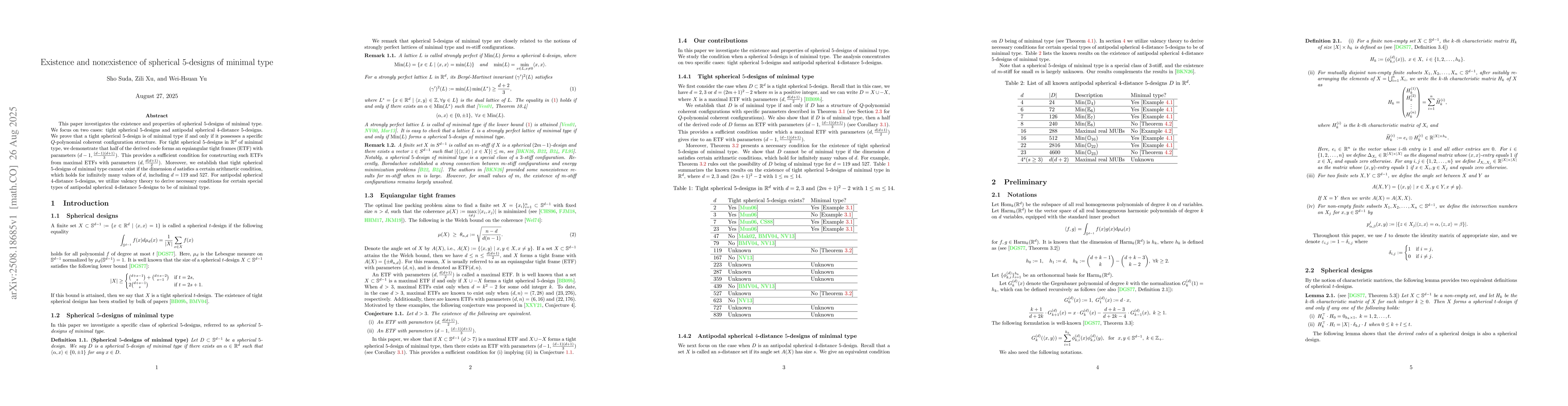 This paper investigates the existence and properties of spherical $5$-designs of minimal type. We focus on two cases: tight spherical $5$-designs and antipodal spherical $4$-distance $5$-designs. We prove that a tight spherical $5$-design is of minimal type if and only if it possesses a specific $Q$-polynomial coherent configuration structure. For tight spherical $5$-designs in $\mathbb{R}^d$ of minimal type, we demonstrate that half of the derived code forms an equiangular tight frames (ETF) with parameters $(d-1, \frac{(d-1)(d+1)}{3})$. This provides a sufficient condition for constructing such ETFs from maximal ETFs with parameters $(d, \frac{d(d+1)}{2})$. Moreover, we establish that tight spherical $5$-designs of minimal type cannot exist if the dimension $d$ satisfies a certain arithmetic condition, which holds for infinitely many values of $d$, including $d=119$ and $527$. For antipodal spherical $4$-distance $5$-designs, we utilize valency theory to derive necessary conditions for certain special types of antipodal spherical $4$-distance $5$-designs to be of minimal type.