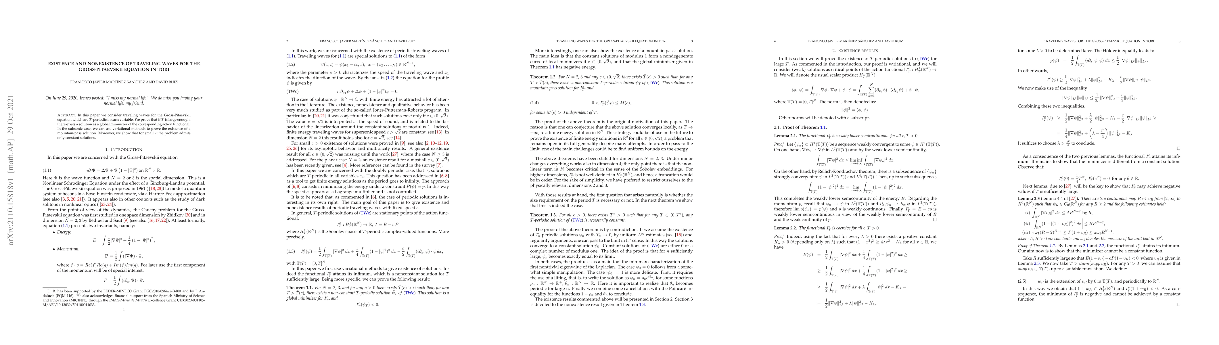 Summary: This paper investigates traveling waves for the Gross-Pitaevskii equation in tori, proving the existence of non-constant solutions for sufficiently large T and constant solutions for small T. Variational methods confirm the existence of a mountain-pass solution in the subsonic case.