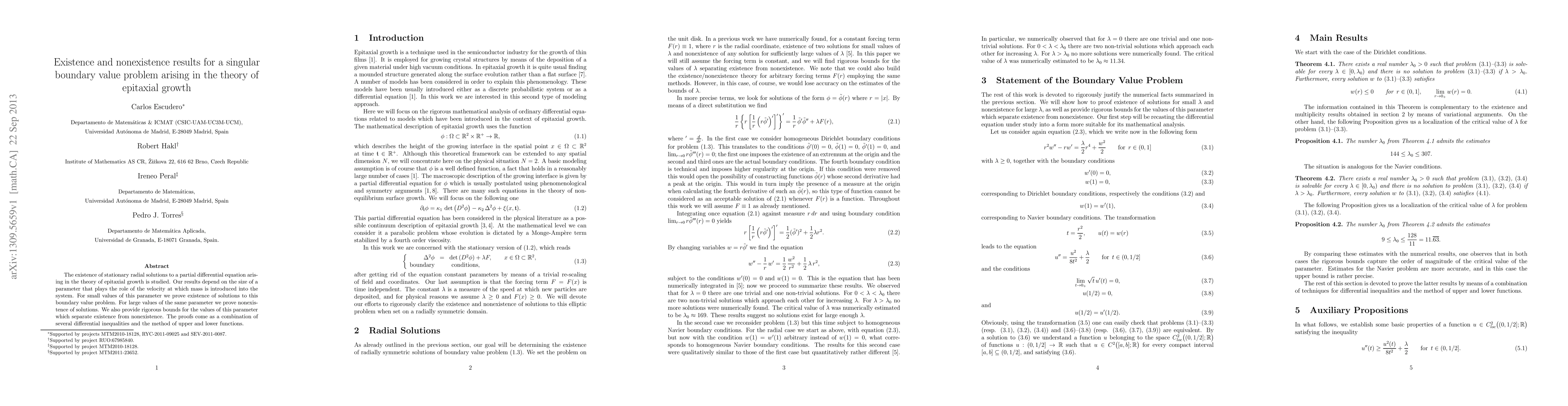 The existence of stationary radial solutions to a partial differential equation arising in the theory of epitaxial growth is studied. Our results depend on the size of a parameter that plays the role of the velocity at which mass is introduced into the system. For small values of this parameter we prove existence of solutions to this boundary value problem. For large values of the same parameter we prove nonexistence of solutions. We also provide rigorous bounds for the values of this parameter which separate existence from nonexistence. The proofs come as a combination of several differential inequalities and the method of upper and lower functions.
