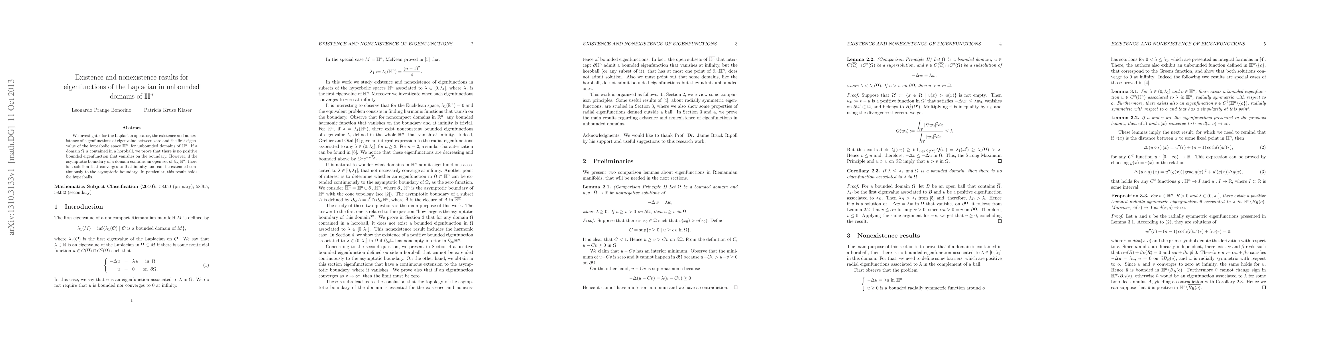 This research paper investigates the existence and nonexistence of eigenfunctions for the Laplacian operator in unbounded domains of hyperbolic space H^n, with key findings including a lack of positive bounded eigenfunctions contained in horoballs and solutions that converge to 0 at infinity under specific boundary conditions.