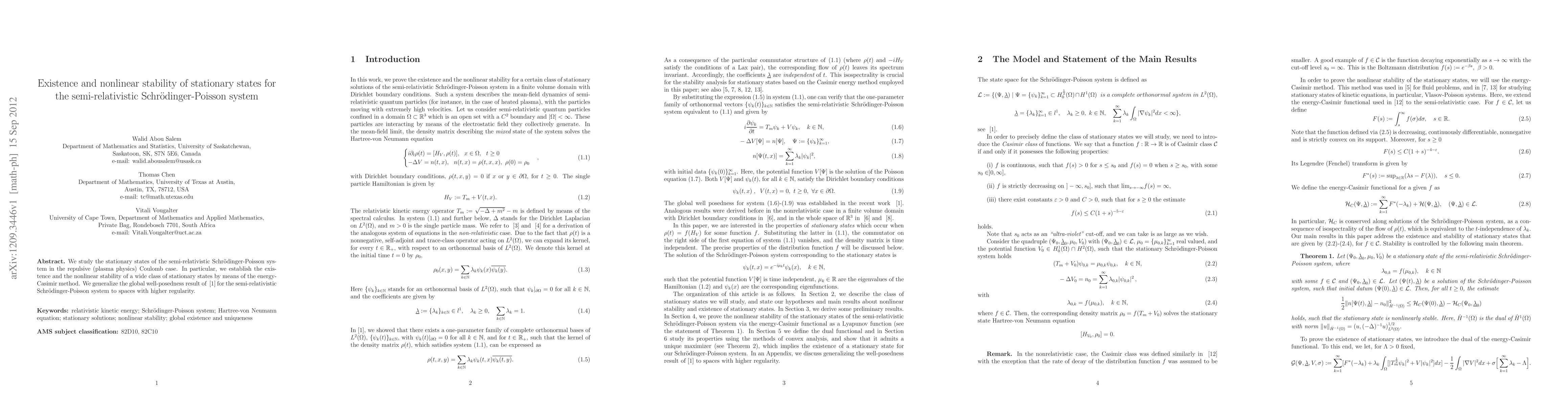 This paper investigates the existence and nonlinear stability of stationary states for the semi-relativistic Schrödinger-Poisson system in the repulsive Coulomb case, establishing these properties for a broad class of states using the energy-Casimir method and extending previous global well-posedness results to higher regularity spaces.