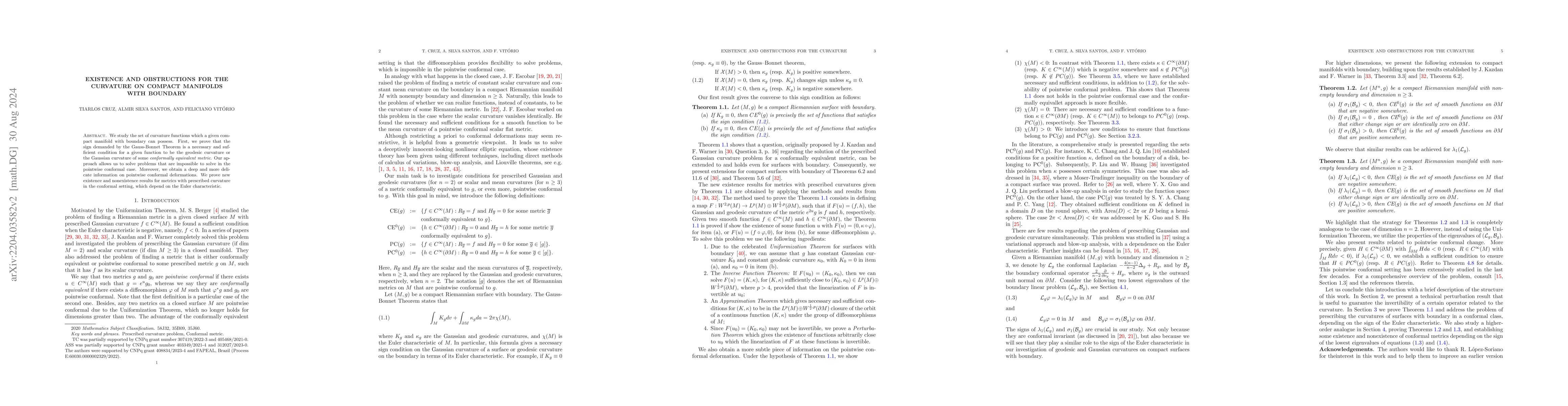 This paper explores the existence and obstructions of curvature functions on manifolds with boundary, proving that the Gauss-Bonnet Theorem's sign condition is necessary and sufficient for geodesic or Gaussian curvature. It introduces a novel approach to solving problems beyond the conformal method's reach and extends results on metrics with prescribed curvature based on the Euler characteristic.