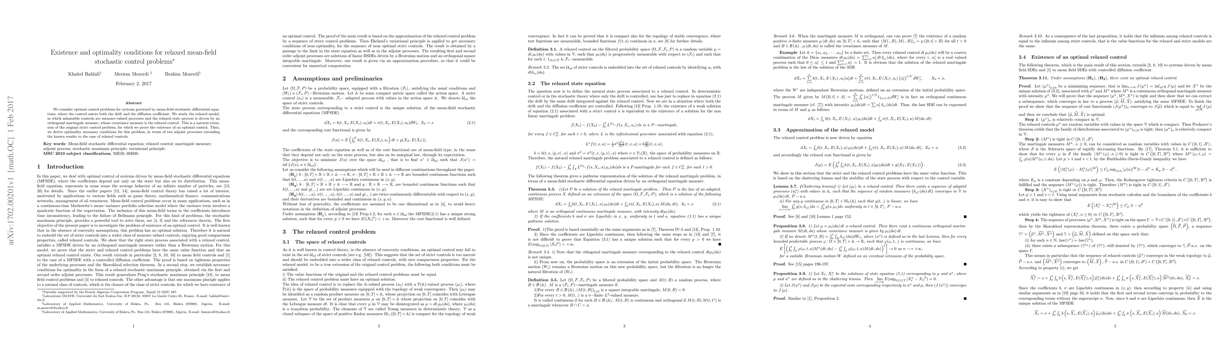 This paper investigates optimal control problems for mean-field stochastic differential equations, establishing the existence of an optimal control in a relaxed model where controls are measure-valued processes. It also derives necessary optimality conditions involving two adjoint processes.