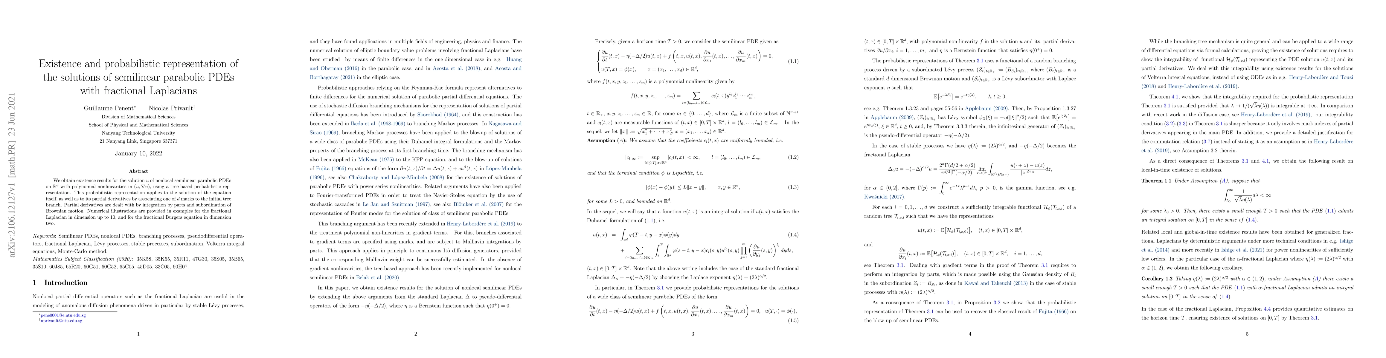 This paper establishes existence results for solutions of nonlocal semilinear parabolic PDEs using a probabilistic representation based on tree structures. It also provides numerical examples illustrating the method for fractional Laplacians and the fractional Burgers equation.