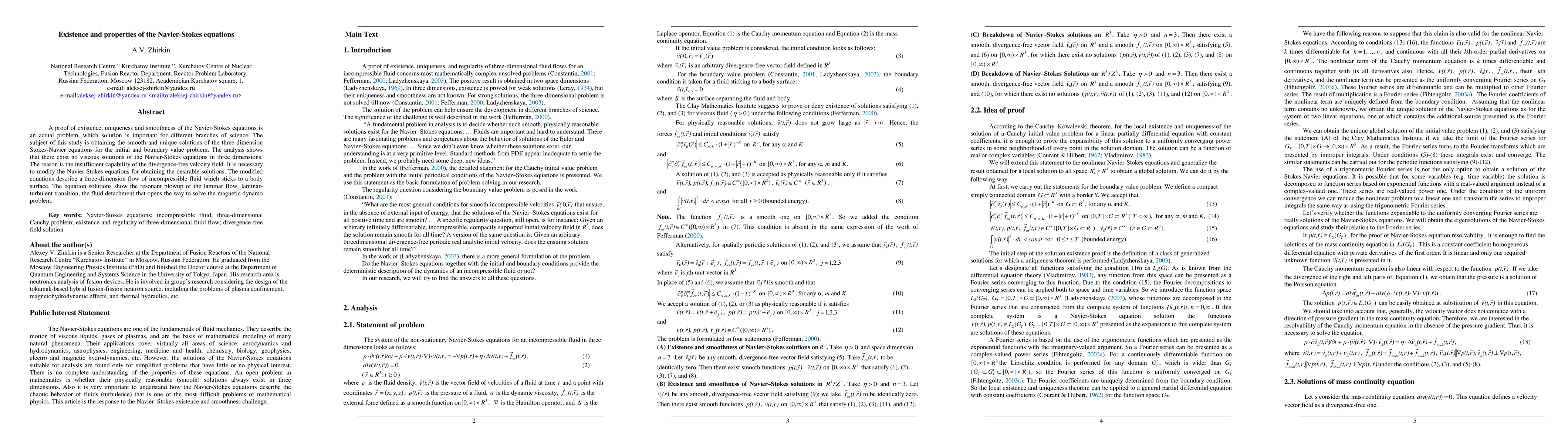 This study investigates the existence and properties of the Navier-Stokes equations, revealing that no smooth solutions exist in three dimensions due to the divergence-free velocity field's limitations. The research proposes modified equations to describe the three-dimensional flow of incompressible fluid, highlighting phenomena like laminar-turbulent transition and fluid detachment.