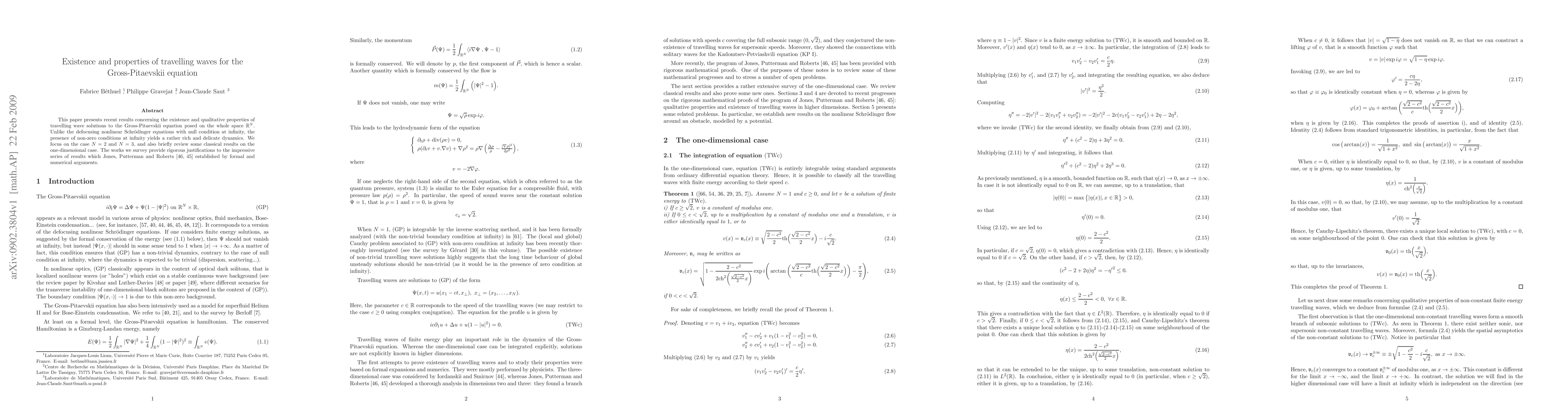 This paper presents recent results concerning the existence and qualitative properties of travelling wave solutions to the Gross-Pitaevskii equation posed on the whole space R^N. Unlike the defocusing nonlinear Schr\"odinger equations with null condition at infinity, the presence of non-zero conditions at infinity yields a rather rich and delicate dynamics. We focus on the case N = 2 and N = 3, and also briefly review some classical results on the one-dimensional case. The works we survey provide rigorous justifications to the impressive series of results which Jones, Putterman and Roberts established by formal and numerical arguments.