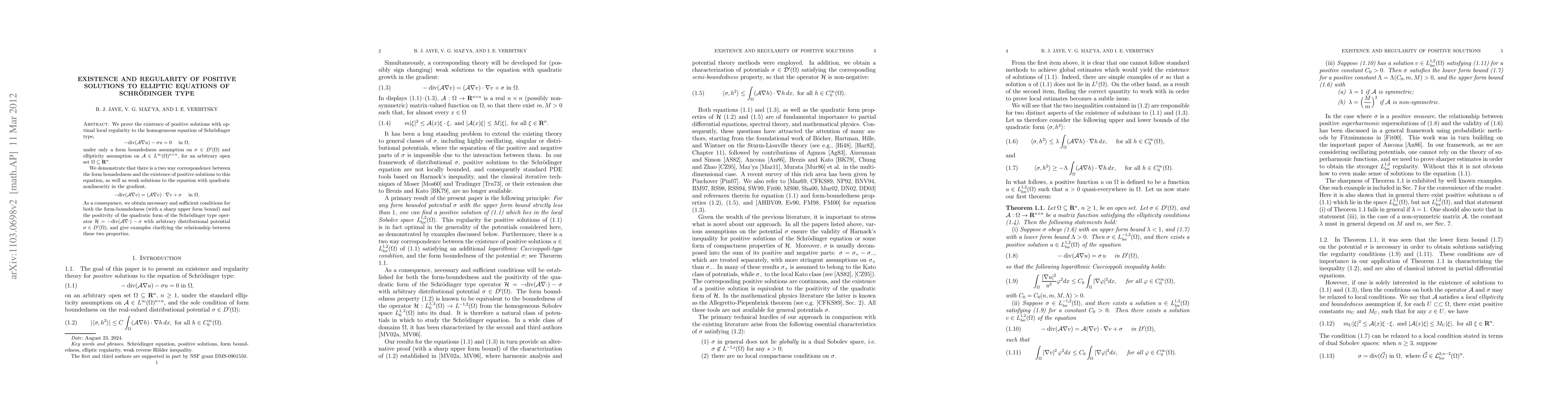 This paper proves the existence of positive solutions with optimal local regularity for Schrödinger-type elliptic equations, given form boundedness of a distribution and ellipticity of a matrix. It establishes a correspondence between form-boundedness and existence of solutions, offering necessary and sufficient conditions for form-boundedness and positivity of quadratic forms of Schrödinger operators with distributional potentials. Examples illustrate the interplay between these properties.