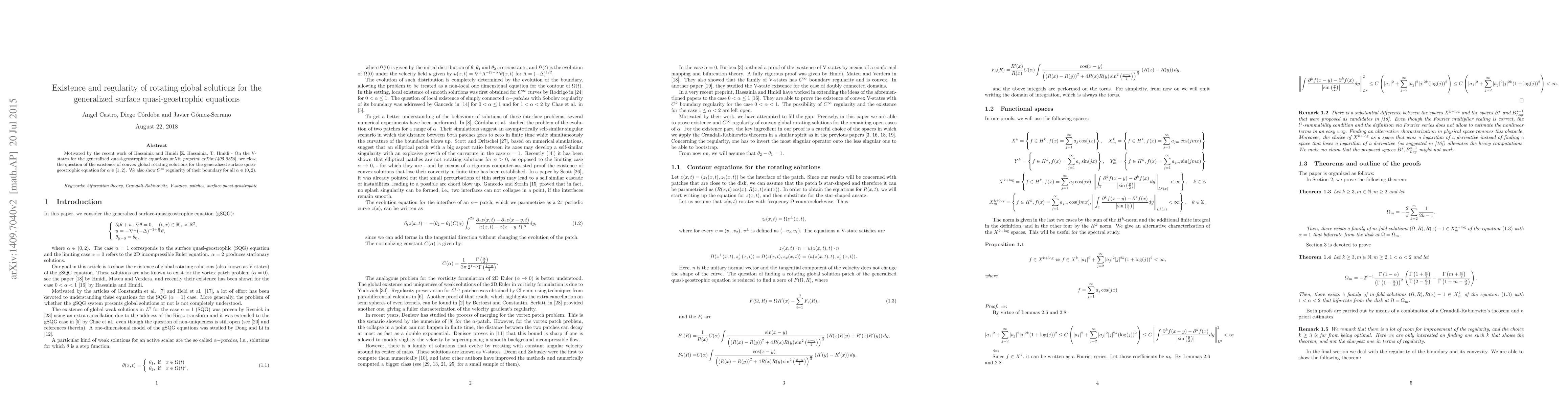 Motivated by the recent work of Hassainia and Hmidi [Z. Hassainia, T. Hmidi - On the {V}-states for the generalized quasi-geostrophic equations,arXiv preprint arXiv:1405.0858], we close the question of the existence of convex global rotating solutions for the generalized surface quasi-geostrophic equation for $\alpha \in [1,2)$. We also show $C^{\infty}$ regularity of their boundary for all $\alpha \in (0,2)$.