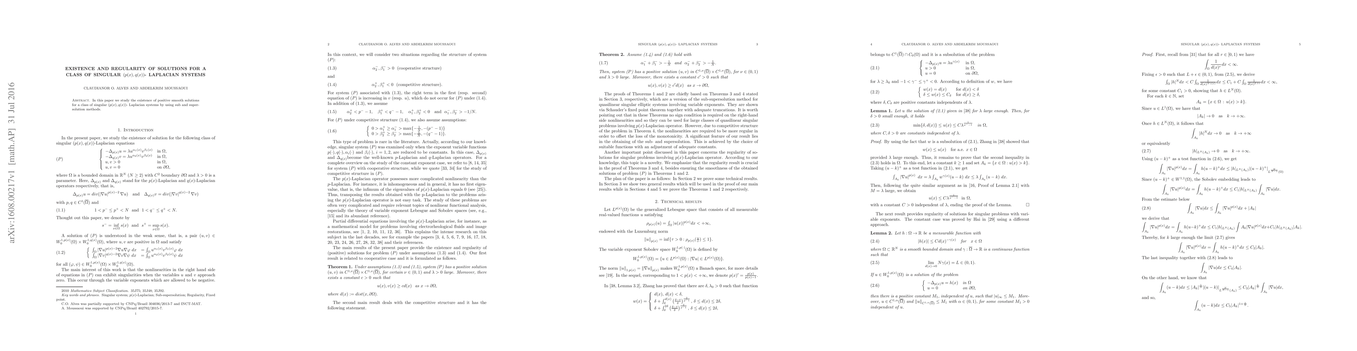 Summary: This paper investigates the existence and regularity of positive smooth solutions for singular (p(x),q(x))-Laplacian systems using sub and supersolution techniques. The study confirms the presence of such solutions under specified conditions.