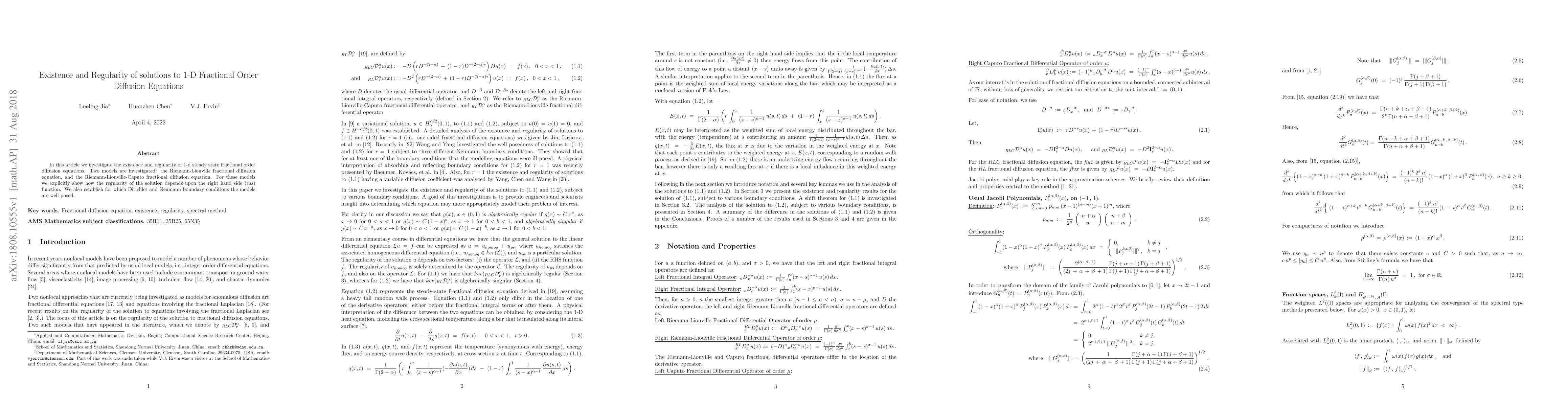 In this article we investigate the existence and regularity of 1-d steady state fractional order diffusion equations. Two models are investigated:the Riemann-Liouville fractional diffusion equation, and the Riemann-Liouville-Caputo fractional diffusion equation. For these models we explicitly show how the regularity of the solution depends upon the right hand side (rhs) function. We also establish for which Dirichlet and Neumann boundary conditions the models are well posed.