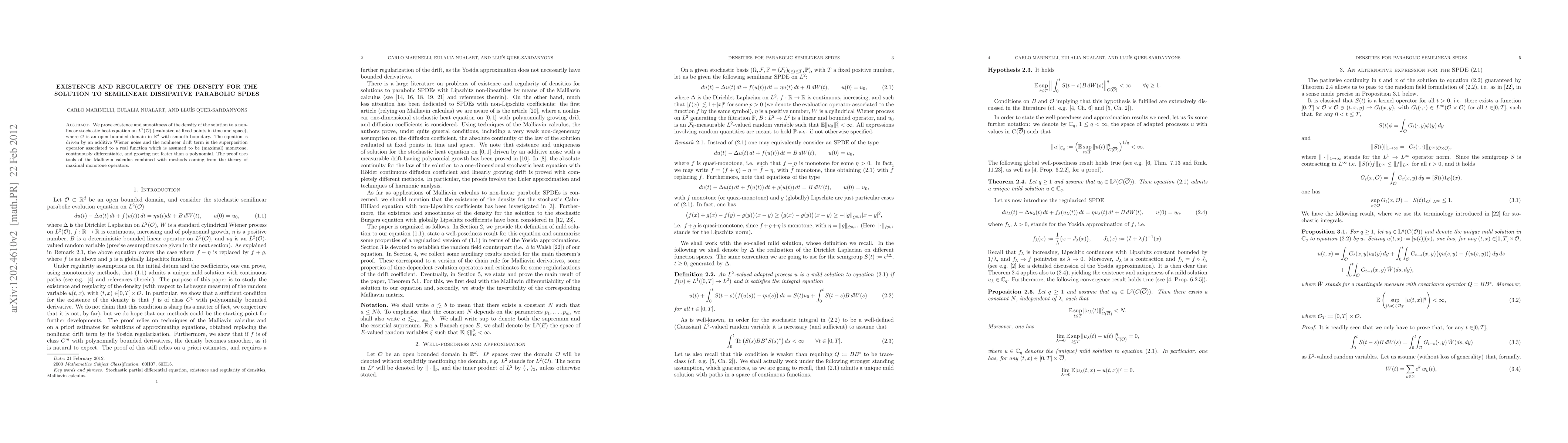 We prove existence and smoothness of the density of the solution to a nonlinear stochastic heat equation on $L^2(\mathcal{O})$ (evaluated at fixed points in time and space), where $\mathcal{O}$ is an open bounded domain in $\mathbb{R}^d$. The equation is driven by an additive Wiener noise and the nonlinear drift term is the superposition operator associated to a real function which is assumed to be (maximal) monotone, continuously differentiable, and growing not faster than a polynomial. The proof uses tools of the Malliavin calculus combined with methods coming from the theory of maximal monotone operators.