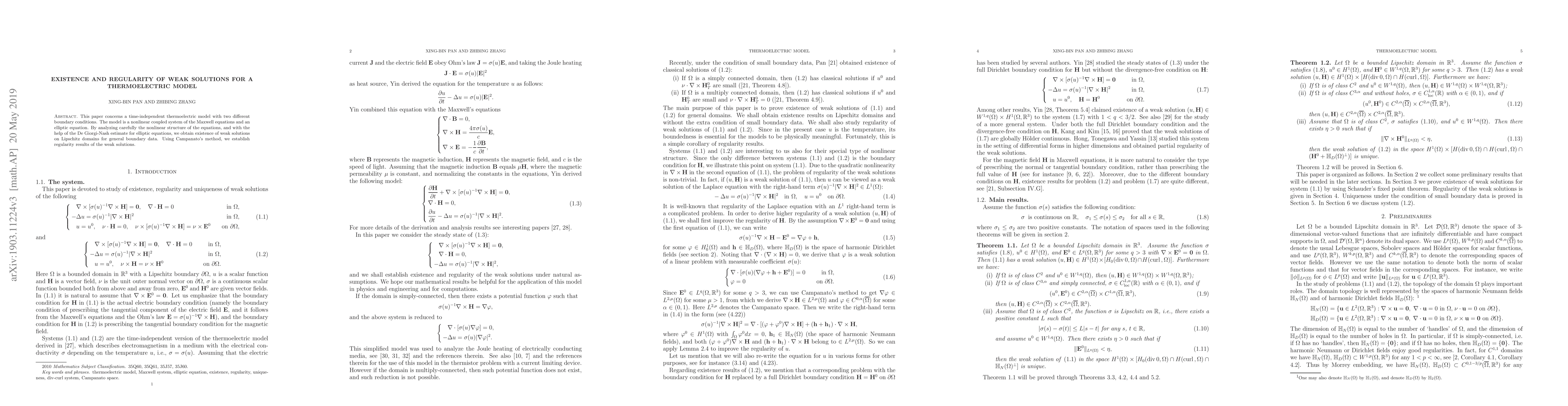 This paper concerns a time-independent thermoelectric model with two different boundary conditions. The model is a nonlinear coupled system of the Maxwell equations and an elliptic equation. By analyzing carefully the nonlinear structure of the equations, and with the help of the De Giorgi-Nash estimate for elliptic equations, we obtain existence of weak solutions on Lipschitz domains for general boundary data. Using Campanato's method, we establish regularity results of the weak solutions.