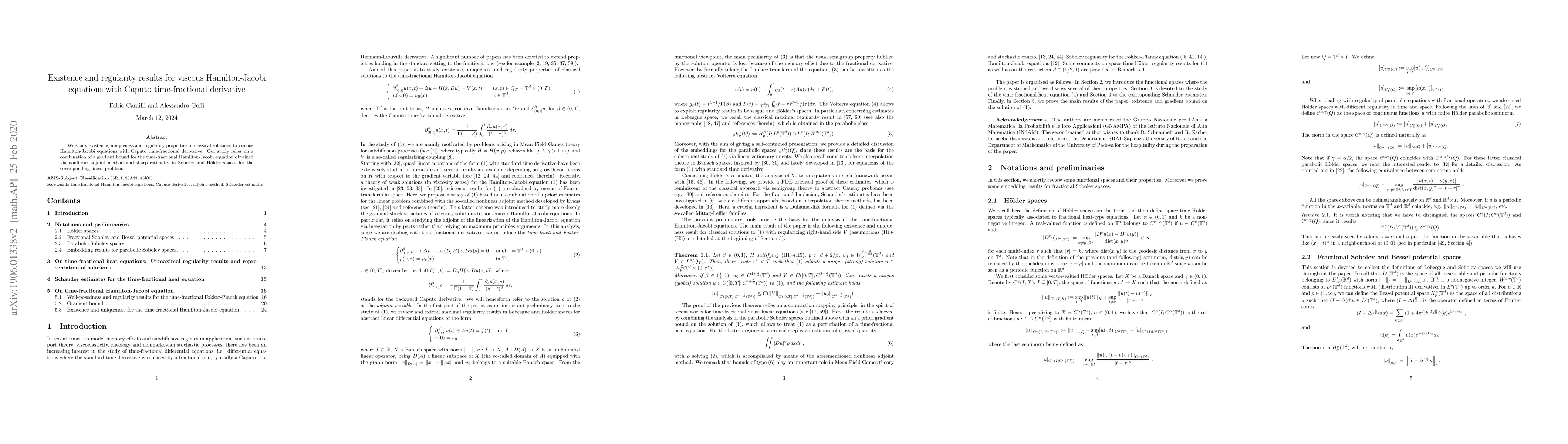 We study existence, uniqueness and regularity properties of classical solutions to viscous Hamilton-Jacobi equations with Caputo time-fractional derivative. Our study relies on a combination of a gradient bound for the time-fractional Hamilton-Jacobi equation obtained via nonlinear adjoint method and sharp estimates in Sobolev and H\"older spaces for the corresponding linear problem.