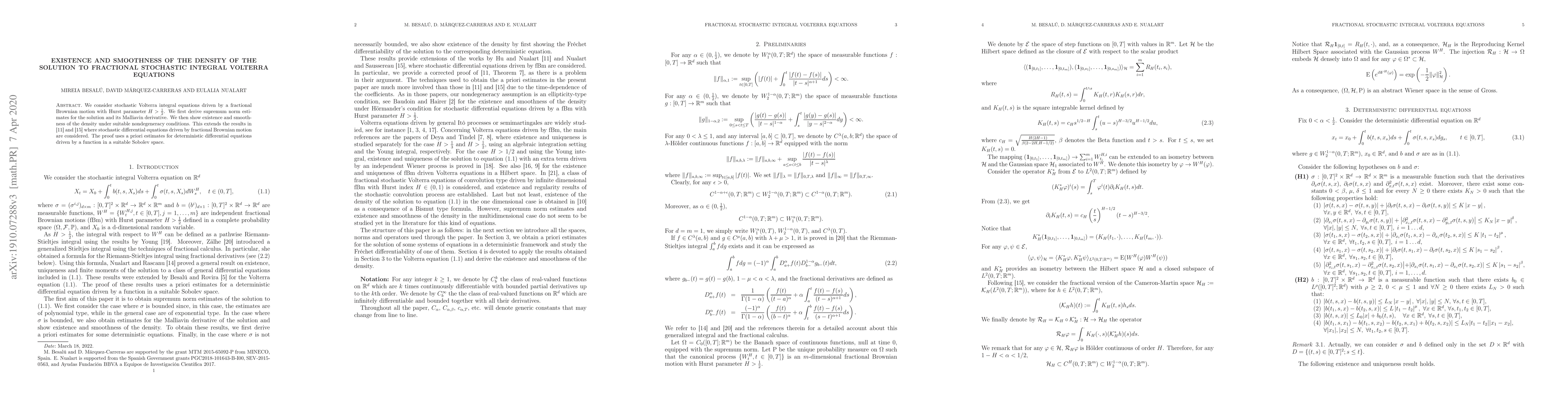 We consider stochastic Volterra integral equations driven by a fractional Brownian motion with Hurst parameter H > 1/2 . We first derive supremum norm estimates for the solution and its Malliavin derivative. We then show existence and smoothness of the density under suitable nondegeneracy conditions. This extends the results in Hu-Nualart and Nualart-Saussereau where stochastic differential equations driven by fractional Brownian motion are considered. The proof uses a priori estimates for deterministic differential equations driven by a function in a suitable Sobolev space.