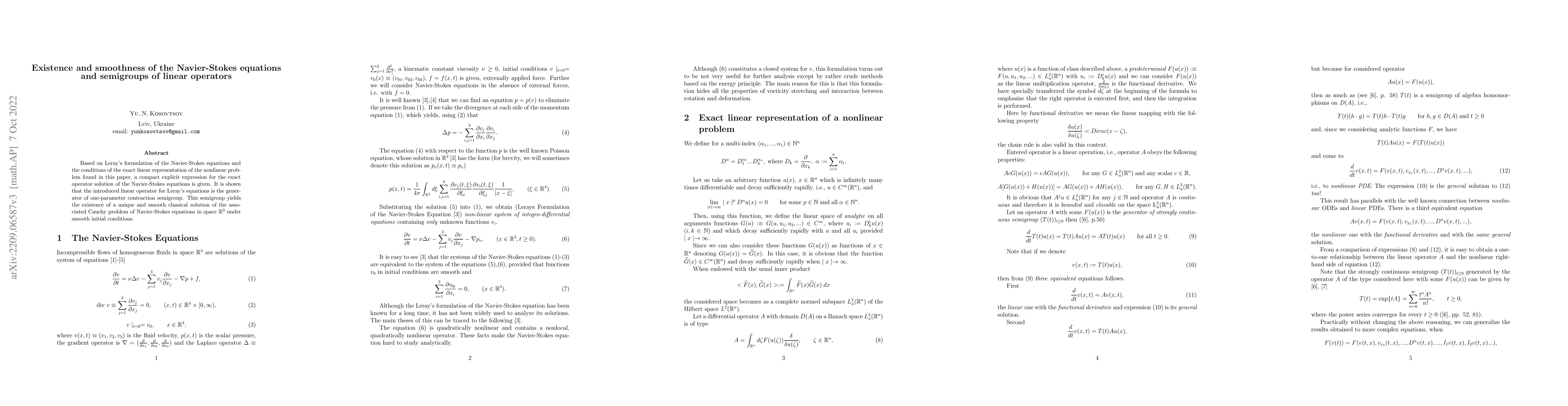 Based on Leray's formulation of the Navier-Stokes equations and the conditions of the exact linear representation of the nonlinear problem found in this paper, a compact explicit expression for the exact operator solution of the Navier-Stokes equations is given. It is shown that the introduced linear operator for Leray's equations is the generator of one-parameter contraction semigroup. This semigroup yields the existence of a unique and smooth classical solution of the associated Cauchy problem of Navier-Stokes equations in space $\mathbb{R}^3$ under smooth initial conditions.