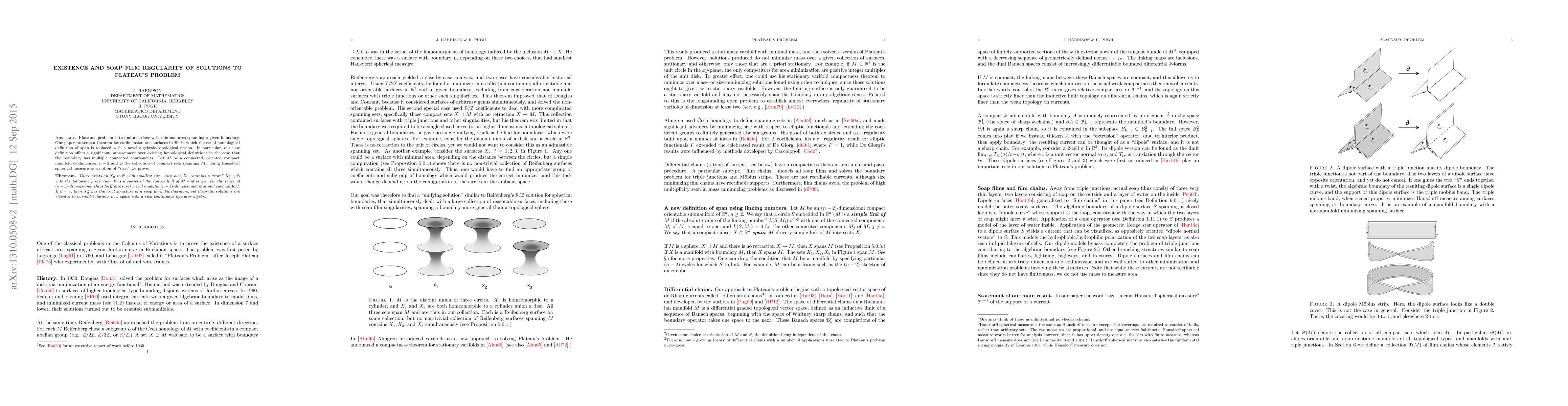 This paper proves the existence of a minimal, almost-everywhere real analytic compact set X_0 that spans a given compact orientable (n-2)-dimensional submanifold M in R^n, using (n-1)-dimensional Hausdorff spherical measure. For n=3, X_0 resembles a soap film, as per Plateau's problem. The minimizer X_0 is described as the support of a current S_0, with M as the algebraic boundary of S_0. The research also touches upon the case where M has codimension > 2.