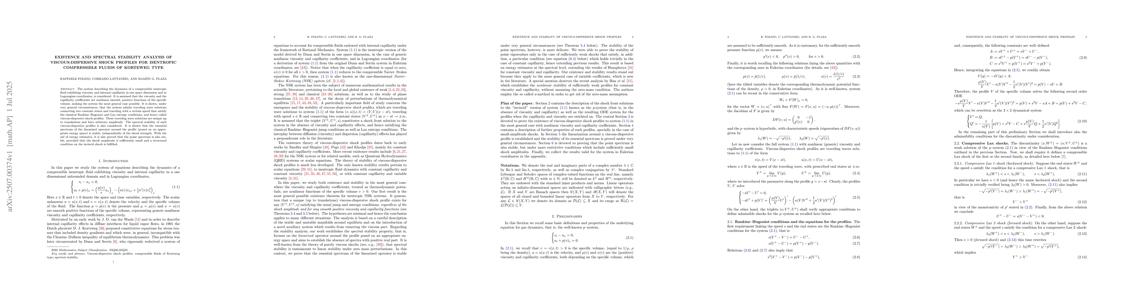 The system describing the dynamics of a compressible isentropic fluid exhibiting viscosity and internal capillarity in one space dimension and in Lagrangian coordinates, is considered. It is assumed that the viscosity and the capillarity coefficients are nonlinear smooth, positive functions of the specific volume, making the system the most general case possible. It is shown, under very general circumstances, that the system admits traveling wave solutions connecting two constant states and traveling with a certain speed that satisfy the classical Rankine-Hugoniot and Lax entropy conditions, and hence called viscous-dispersive shock profiles. These traveling wave solutions are unique up to translations and have arbitrary amplitude. The spectral stability of such viscous-dispersive profiles is also considered. It is shown that the essential spectrum of the linearized operator around the profile (posed on an appropriate energy space) is stable, independently of the shock strength. With the aid of energy estimates, it is also proved that the point spectrum is also stable, provided that the shock amplitude is sufficiently small and a structural condition on the inviscid shock is fulfilled.