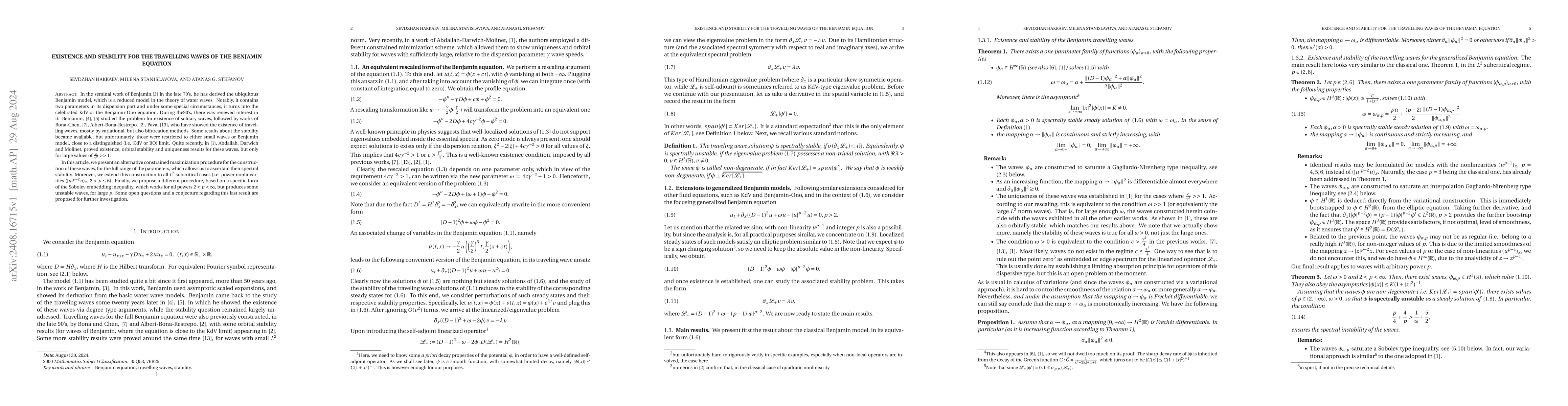 This paper presents a novel constrained maximization method for constructing traveling waves in the Benjamin equation across the full range of parameters, ensuring spectral stability. It also extends this construction to all $L^2$ subcritical cases and proposes an alternative procedure based on Sobolev embedding for broader nonlinearity powers, though it notes some instability for large $p$.