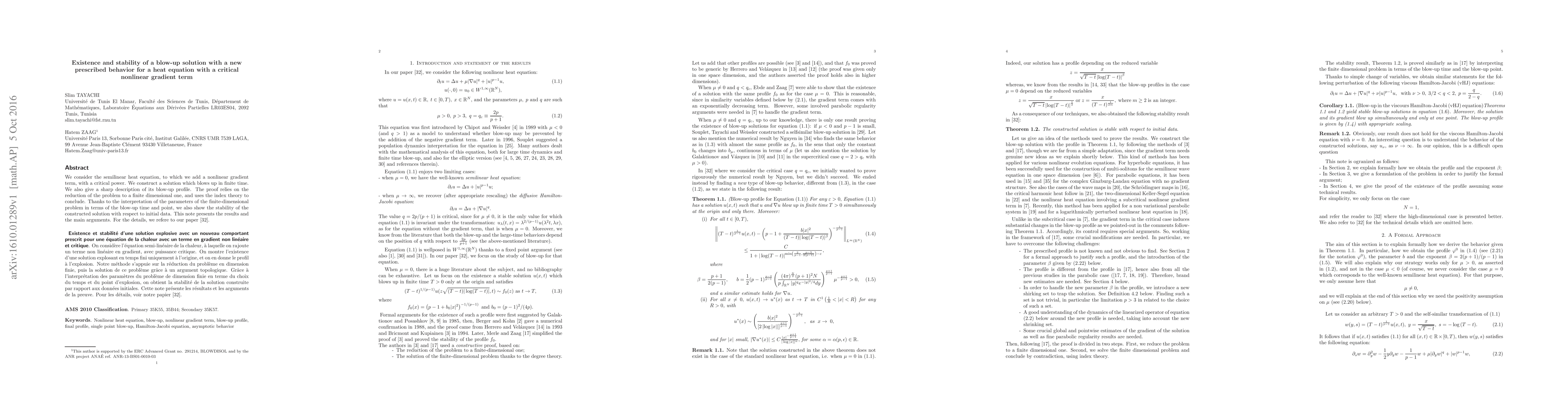 We consider the semilinear heat equation, to which we add a nonlinear gradient term, with a critical power. We construct a solution which blows up in finite time. We also give a sharp description of its blow-up profile. The proof relies on the reduction of the problem to a finite dimensional one, and uses the index theory to conclude. Thanks to the interpretation of the parameters of the finite-dimensional problem in terms of the blow-up time and point, we also show the stability of the constructed solution with respect to initial data. This note presents the results and the main arguments. For the details, we refer to our paper \cite{TZ15}.