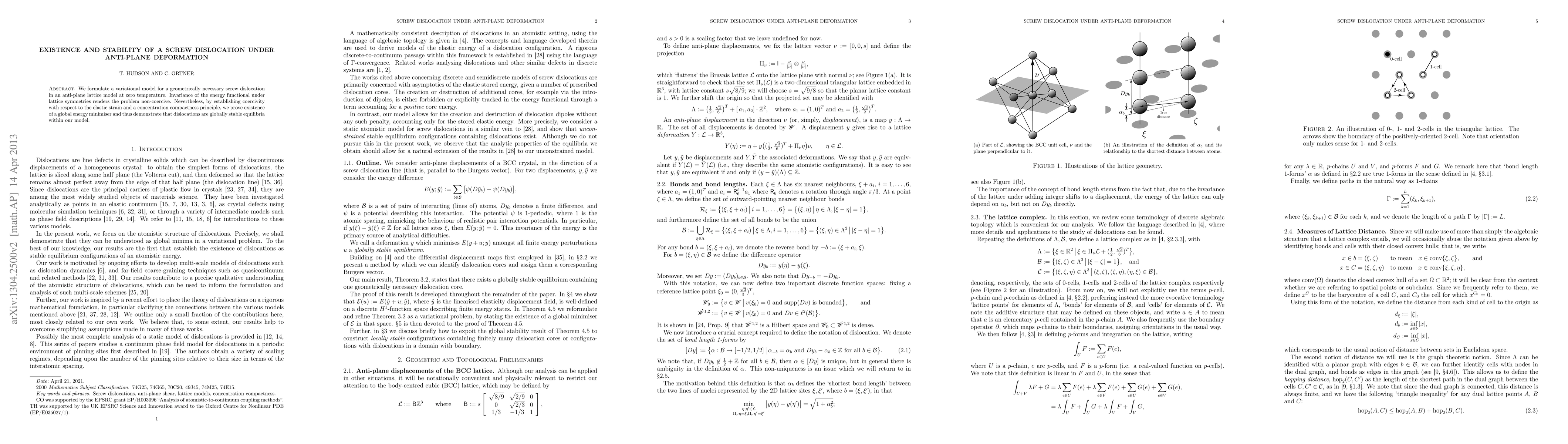 We formulate a variational model for a geometrically necessary screw dislocation in an anti-plane lattice model at zero temperature. Invariance of the energy functional under lattice symmetries renders the problem non-coercive. Nevertheless, by establishing coercivity with respect to the elastic strain and a concentration compactness principle, we prove existence of a global energy minimiser and thus demonstrate that dislocations are globally stable equilibria within our model.